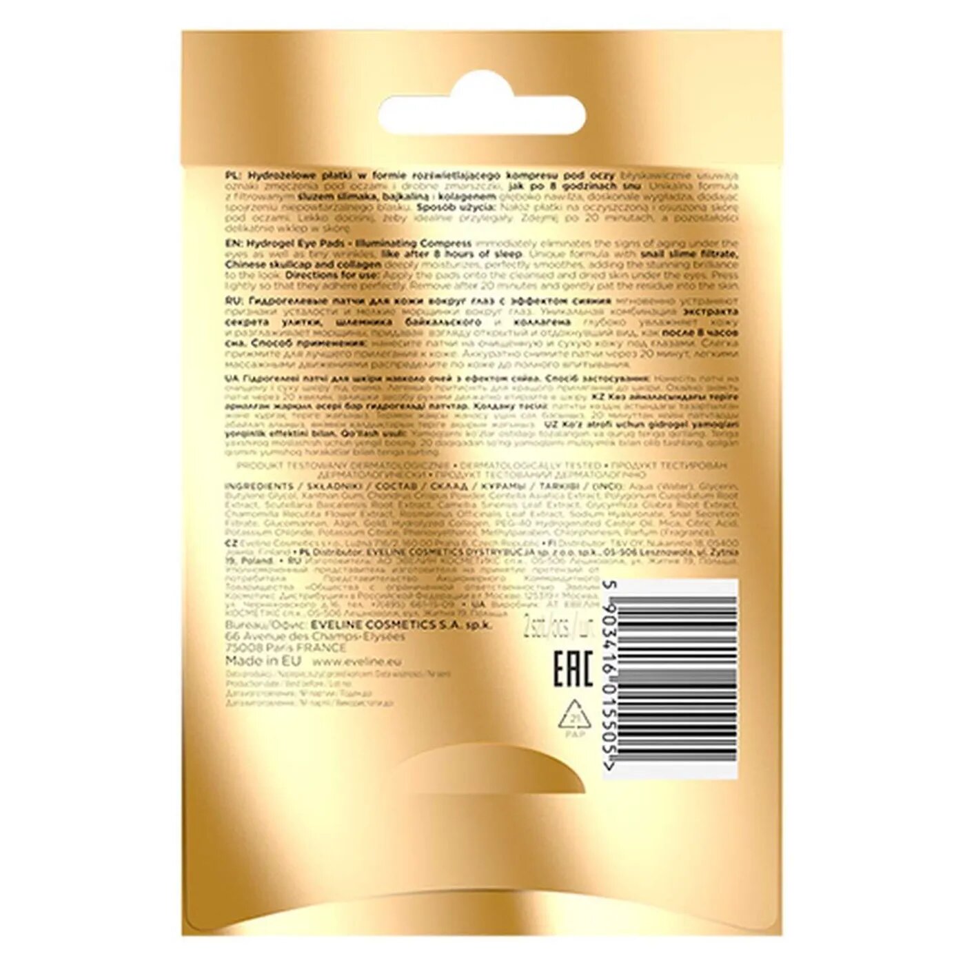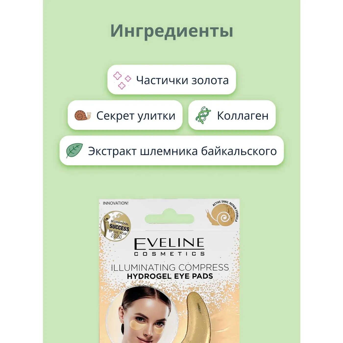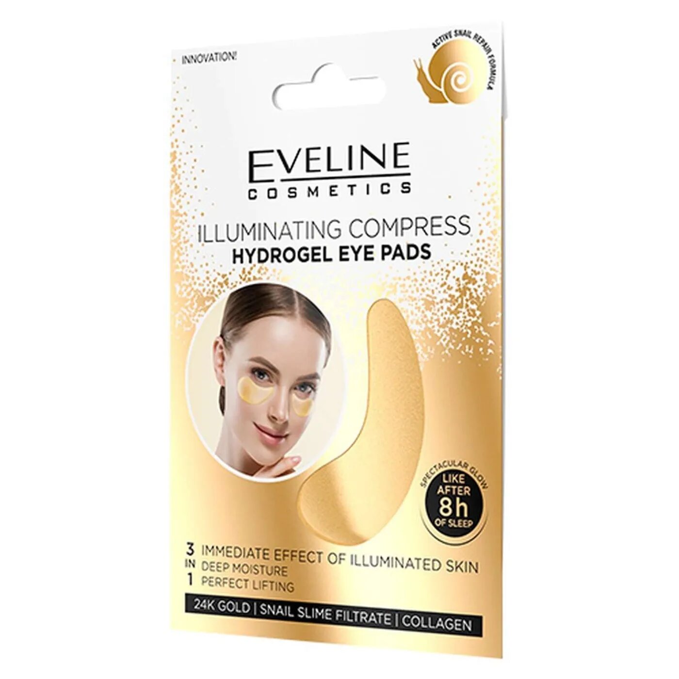 Гидрогелевые охлаждающие патчи для кожи вокруг глаз Illuminating compress hydrogel eye pads с эффектом сияния обогращены частицами 24-каратного золота, экстрактом секрета улитки, коллагеном и экстактом шлемника байкальскогро.