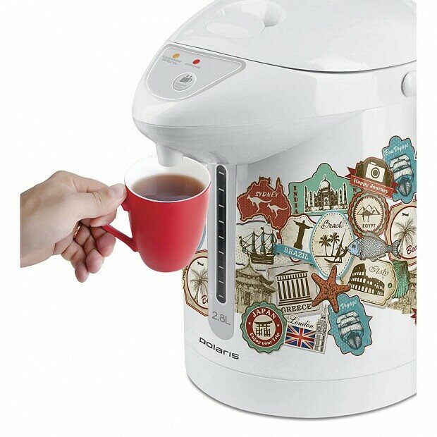 Термопот ''Polaris PWP 2821 Travel'' предназначен для круглосуточного обеспечения горячей питьевой водой. Внутренняя емкость объемом 2,8 л изготовлена из высококачественной стали с антикоррозийными свойствами. Материал характеризуется особой прочностью, устойчивостью к длительным интенсивным нагрузкам и механическим повреждениям. Модель способна поддерживать оптимальный температурный режим в диапазоне от 85 до 92°С на протяжении четырех часов без необходимости повторного кипячения. Подача воды доступна несколькими способами: автоматический активируется путем нажатия на соответствующую клавишу, а если устройство подключено к сети, то кружку можно наполнить, просто прикоснувшись к специальному рычажку. Термопот ''Polaris PWP 2821 Travel'' снабжен ручкой для транспортировки, а также мерной шкалой, чтобы осуществлять контроль за наличием и уровнем жидкости в резервуаре. При отсутствии подключения к сети с напряжением 220 В рекомендуется пользоваться ручной помпой, которая дополнительно снабжена защитной системой блокировки. Корпус имеет надежную конструкцию, а основание термопота поворачивается на 360°.