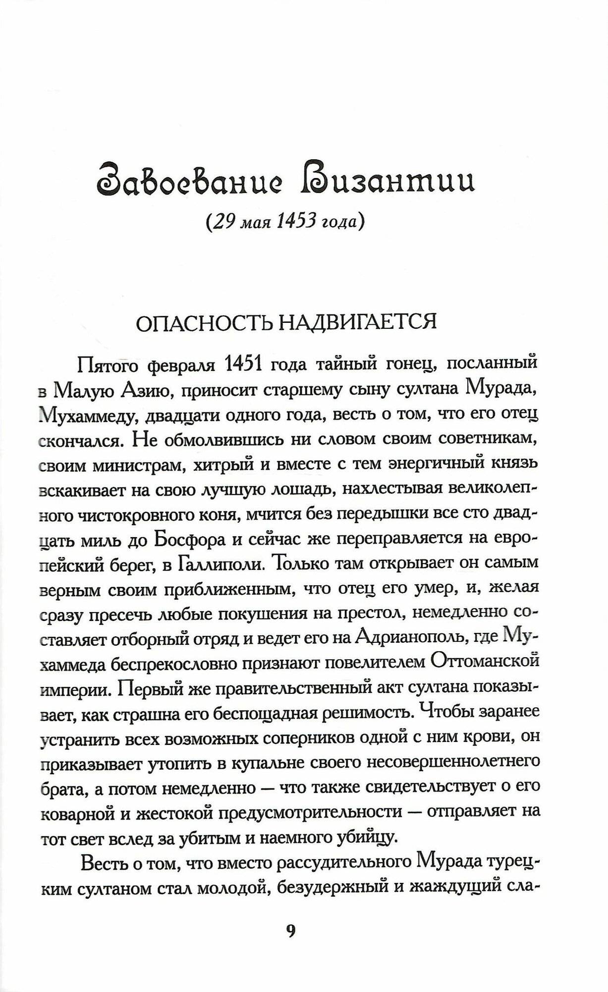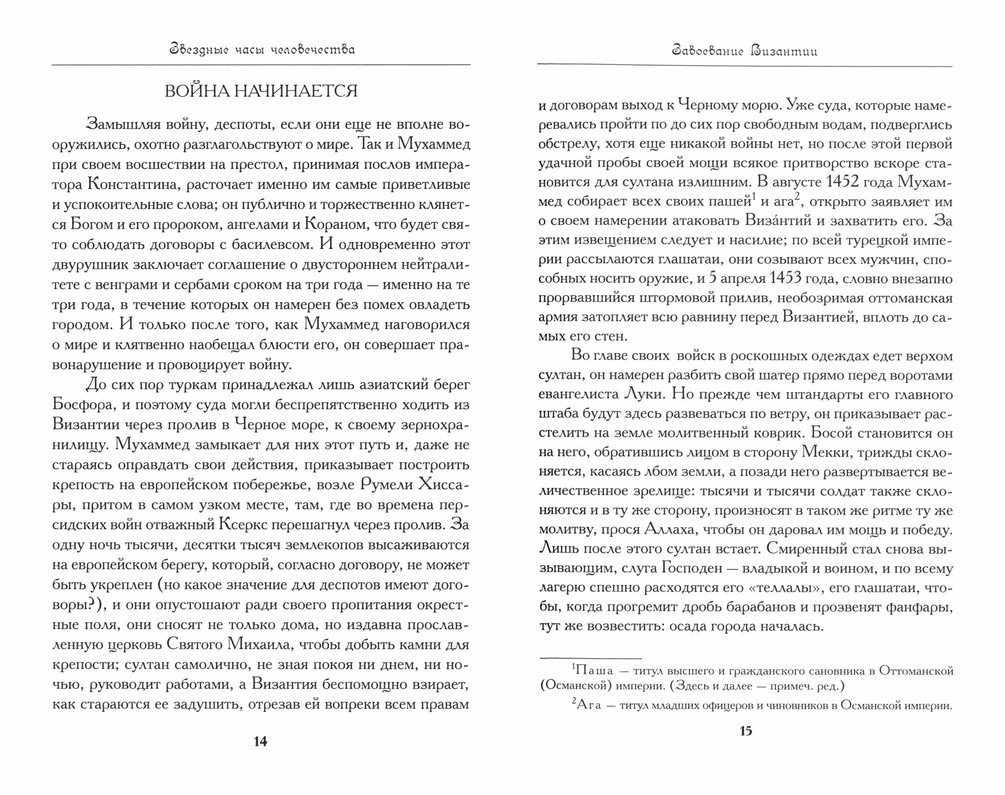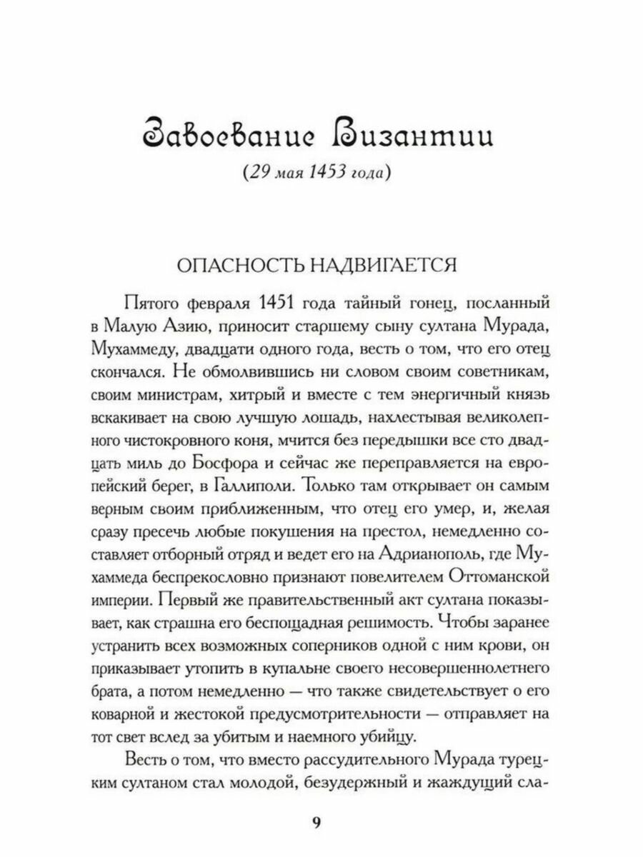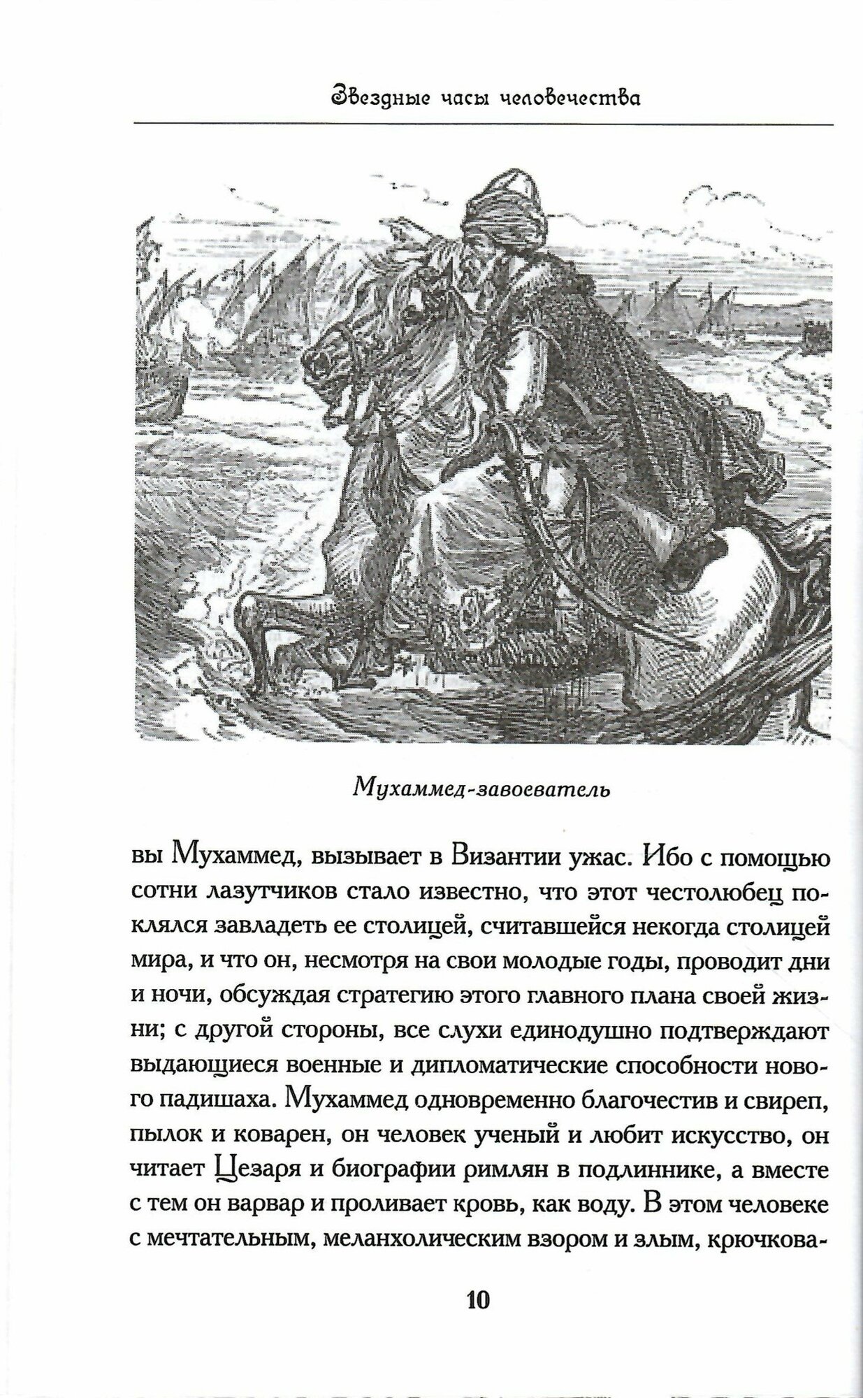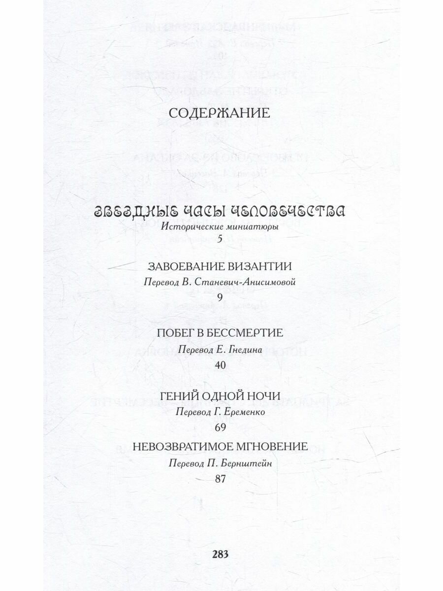 Цикл рассказов «Звездные часы человечества» о важнейших, поворотных моментах мировой истории и людях, сумевших повлиять на ее ход, Стефан Цвейг (1881-1942), один из лучших новеллистов ХХ века, написал в 1927 году. Среди его героев - завоеватель Византии султан Мухаммед, Васко Нуньес де Бальбоа, открыватель Тихого океана; Руже де Лиль, автор великой «Марсельезы»; Гёте и его юная возлюбленная, герои битвы при Ватерлоо, отцы телеграфа, открыватели калифорнийского золота и покорители Южного полюса.