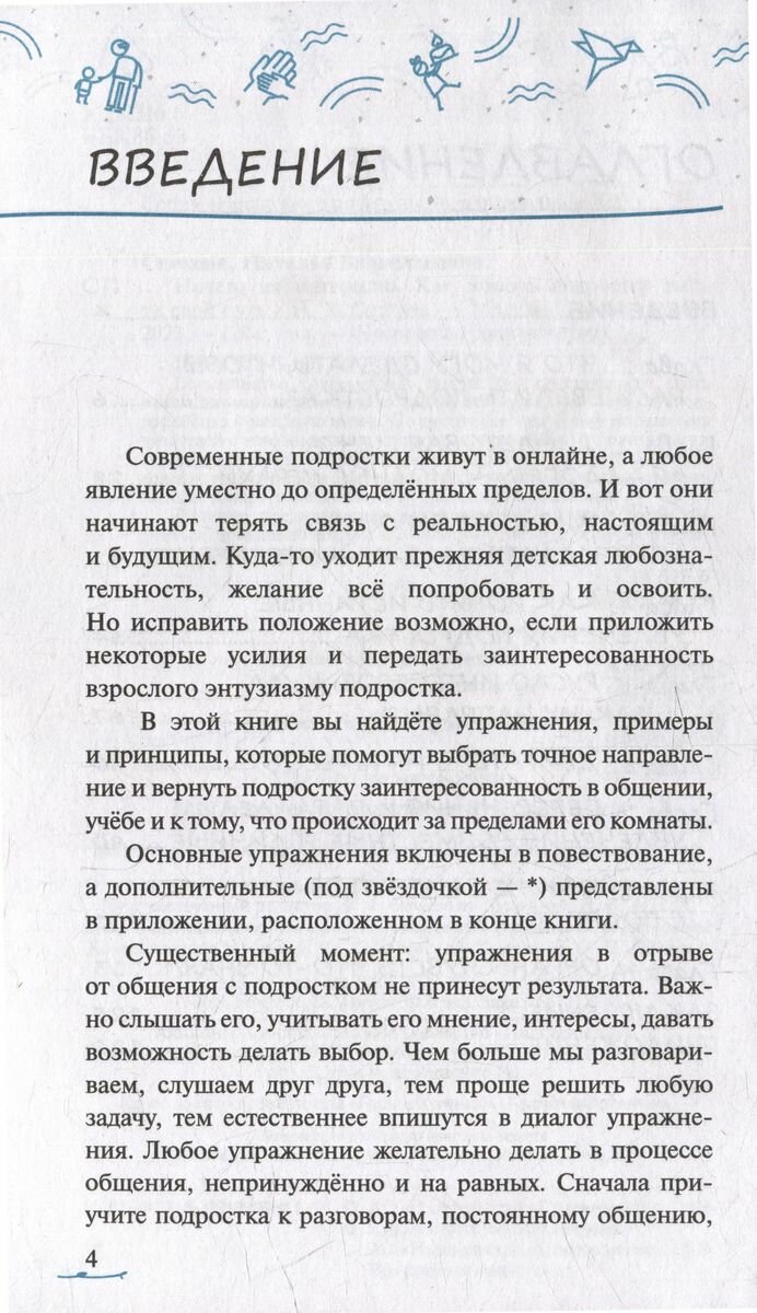 Большинство современных подростков предпочитают жить в онлайне: многие родители хотели бы исправить это и вернуть своего ребёнка в реальную жизнь. Но как это сделать? Книга познакомит читателей с упражнениями, техниками, примерами и принципами, которые помогут наладить общение с подростком, вернуть заинтересованность в общении с друзьями и окружающими людьми, привить интерес к миру, находящемуся за пределами его комнаты. Издание предназначено для родителей, которые хотят научиться правильно взаимодействовать с детьми, получая истинную радость от общения и своего родительства.