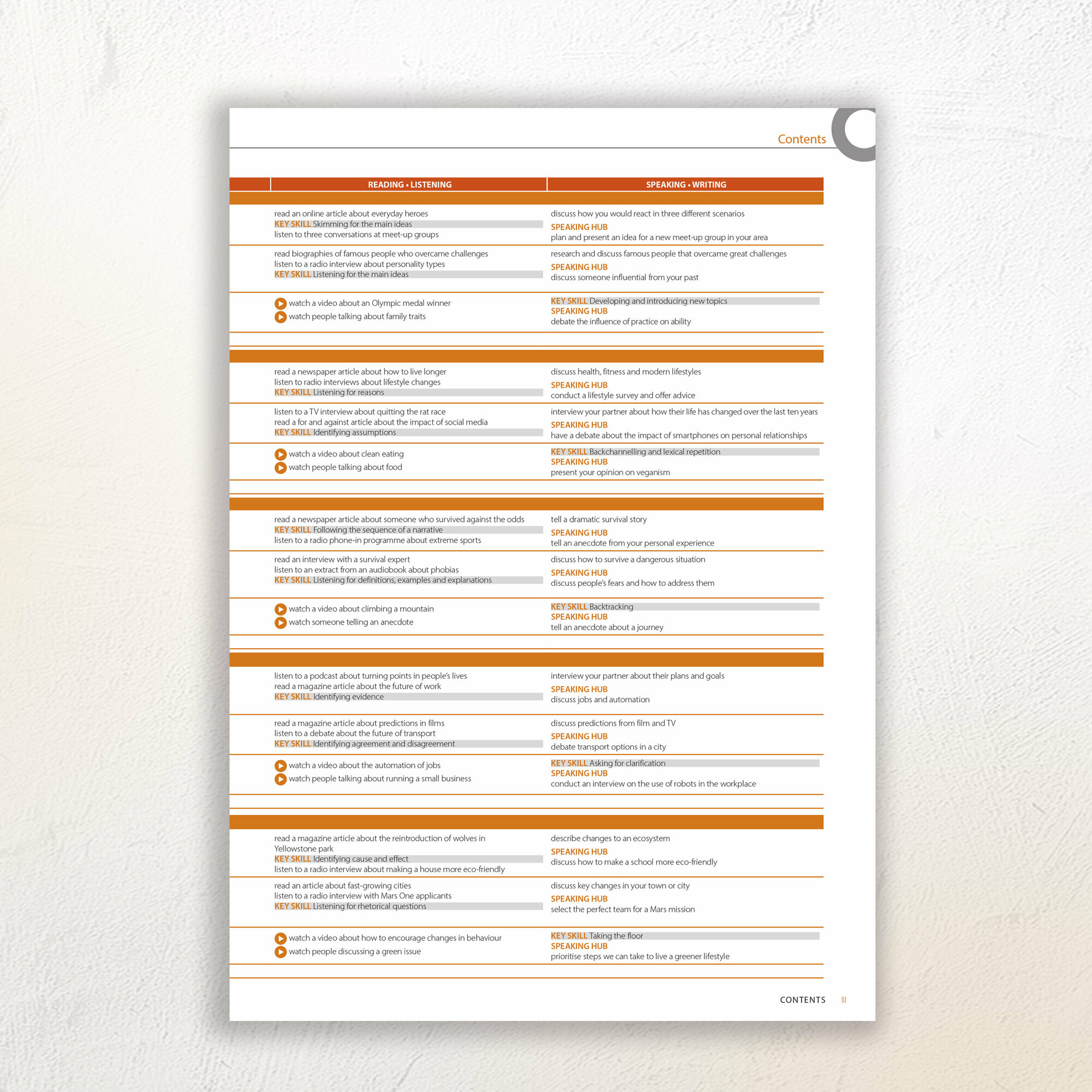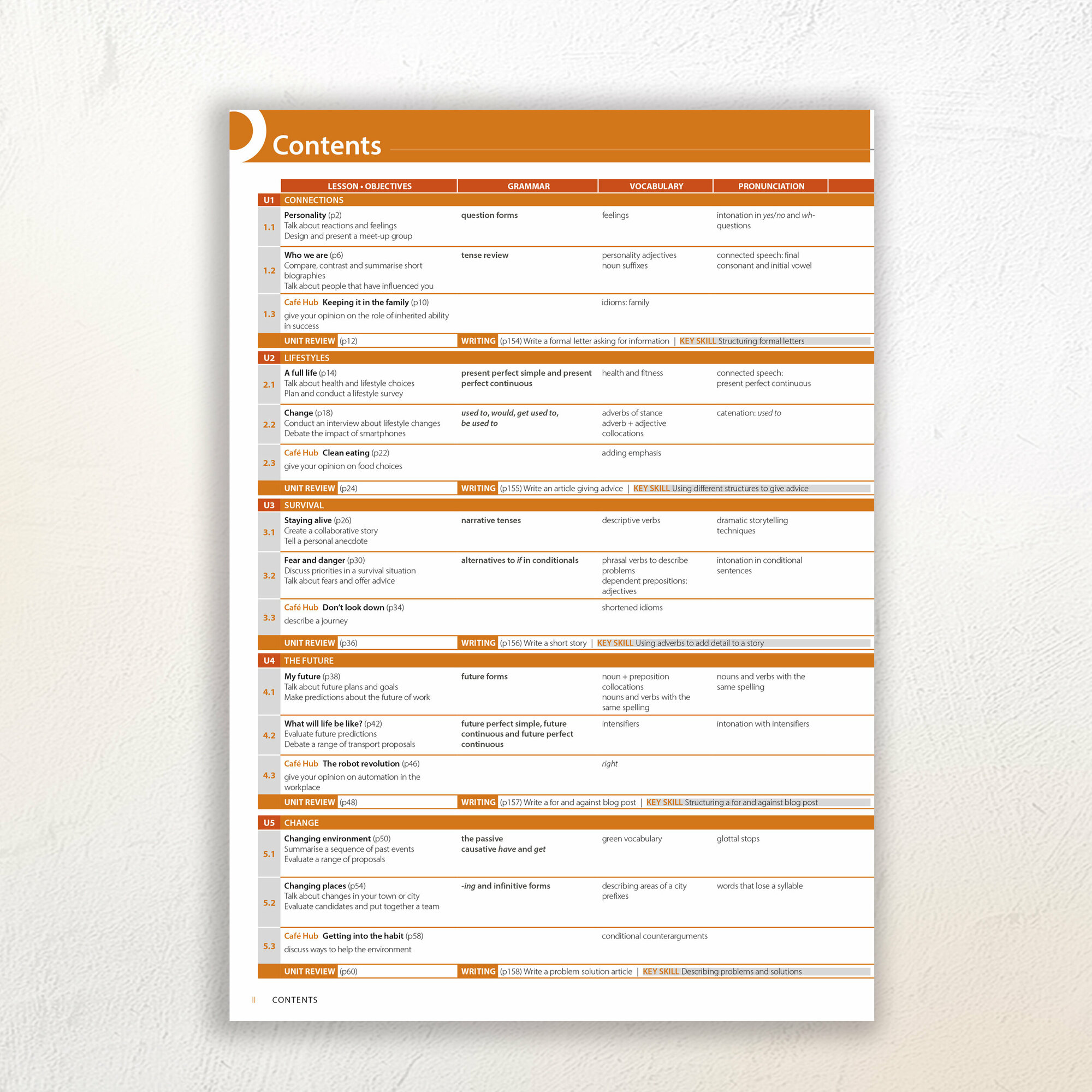 Учебник состоит из десяти тематических разделов с четко организованной системой упражнений для взаимосвязанного развития всех видов речевой деятельности, широким спектром заданий на развитие спонтанной устной речи и увлекательным сериалом Cafe Hub, который построен на реальных жизненных ситуациях. Учебник выходит с кодом доступа к приложению Student's App.