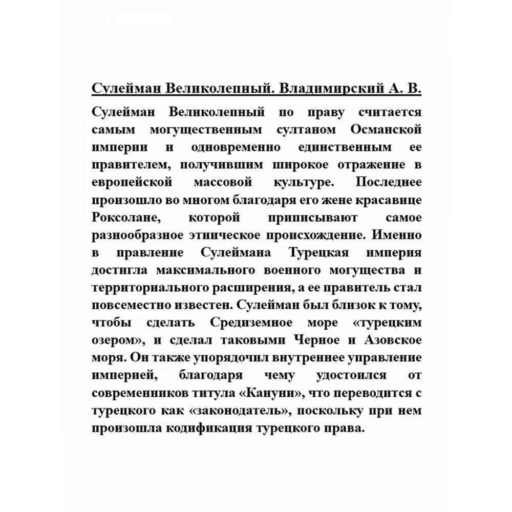 Сулейман Великолепный по праву считается самым могущественным султаном Османской империи и одновременно единственным ее правителем, получившим широкое отражение в европейской массовой культуре. Последнее произошло во многом благодаря его жене красавице Роксолане, которой приписывают самое разнообразное этническое происхождение. Именно в правление Сулеймана Турецкая империя достигла максимального военного могущества и территориального расширения, а ее правитель стал повсеместно известен. Сулейман был близок к тому, чтобы сделать Средиземное море «турецким озером», и сделал таковыми Черное и Азовское моря. Он также упорядочил внутреннее управление империей, благодаря чему удостоился от современников титула «Кануни», что переводится с турецкого как «законодатель», поскольку при нем произошла кодификация турецкого права.