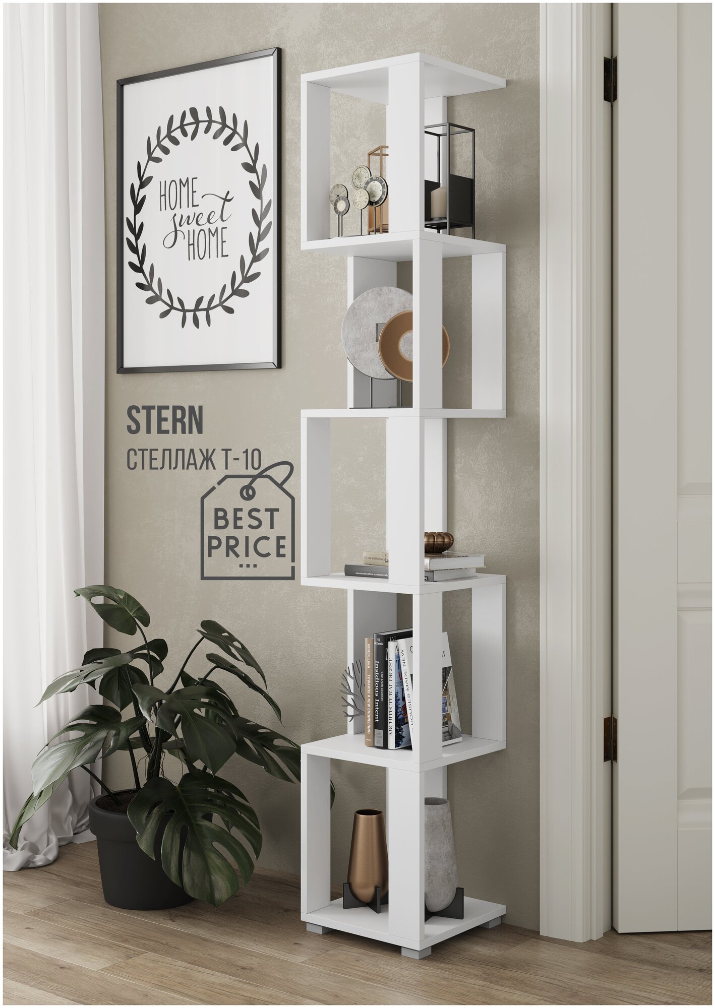 Стеллаж Штерн станет эффектным дополнением системы хранения в любом интерьере. Оригинальная конструкция не занимает много места, при этом позволяет красиво расставить книги, декор, комнатные цветы или детские игрушки. Открытые полки не загромождают пространство, поэтому модель отлично смотрится как в просторной, так и в небольшой по площади комнате.