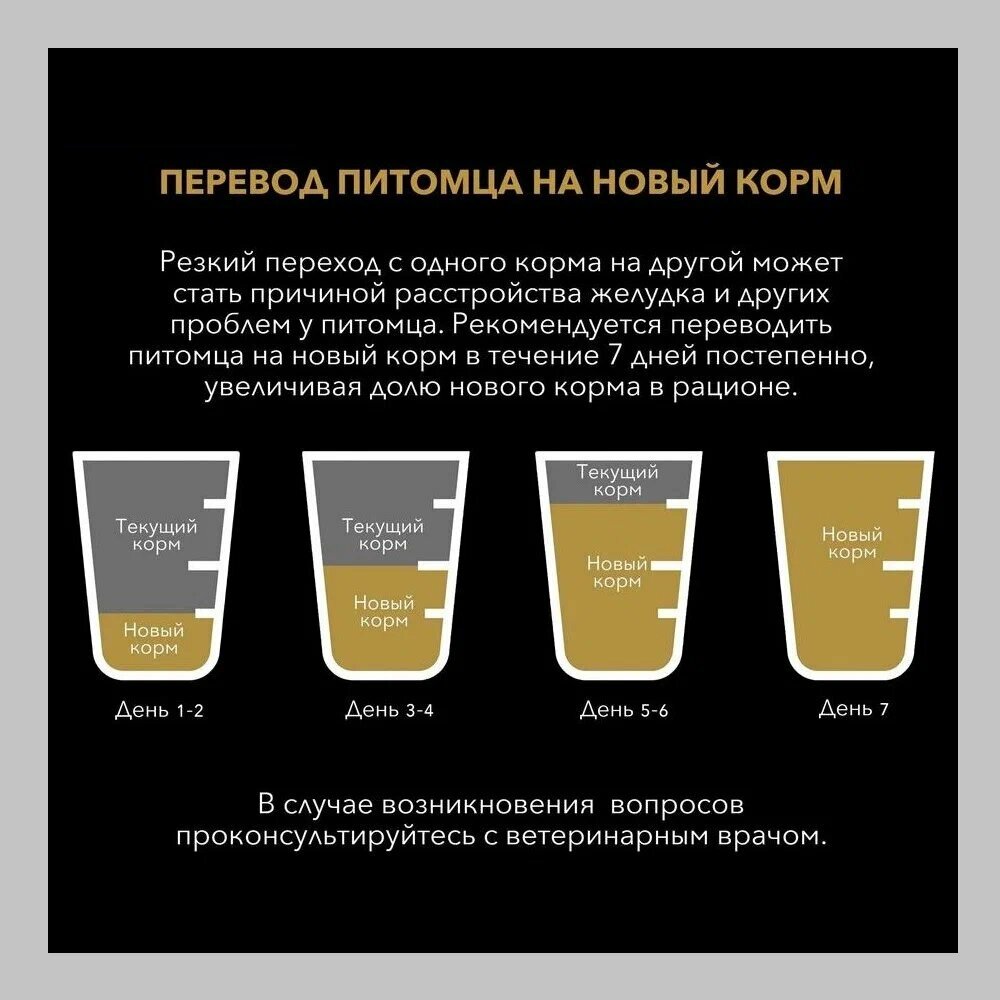 | Инструкция по кормлению | Для котенка весом 0,2-0,5 кг суточная норма кормления 50-120 г; 0,5-1 кг – 120-200 г; 1-1,5 кг – 200-300 г; 1,5-2,5 кг -300-350 г; 2,5-4 кг – 350-400 г; 4-6 кг – 400-480 г; 6-8 кг – 480-600 г. Корм должен быть комнатной температуры. У вашего питомца всегда должен быть доступ к свежей питьевой воде. |