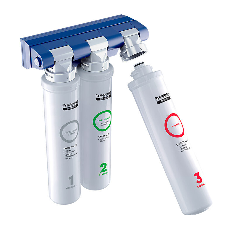 1 ступень — картридж "БАРЬЕР ЭКСПЕРТ Механика". Удаляет любые механические примеси более 5 мкм — песок, пластик, ржавчину и другие.