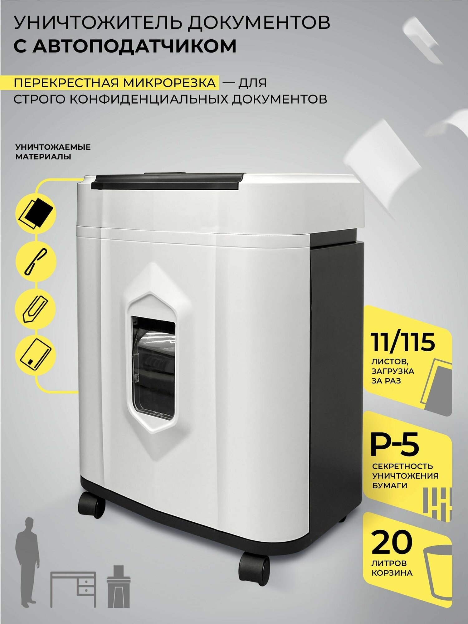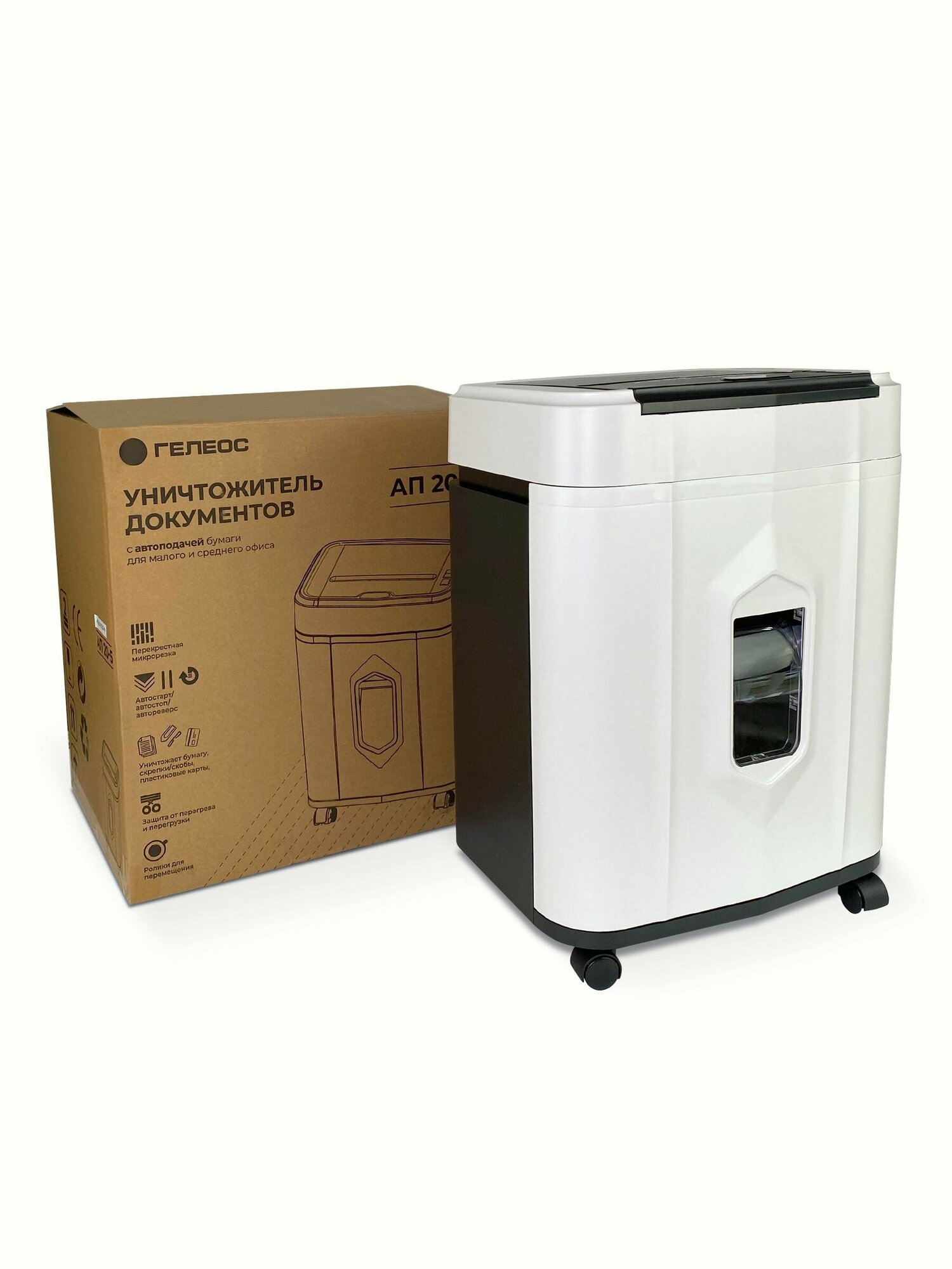 Уничтожитель бумаги Heleos АП20-5, уровень секретности DIN 66399 P-5, резка на перекрестный, одновременно до 131 листов, емкость корзины 20л, режет скрепки, скобы, пл.карты