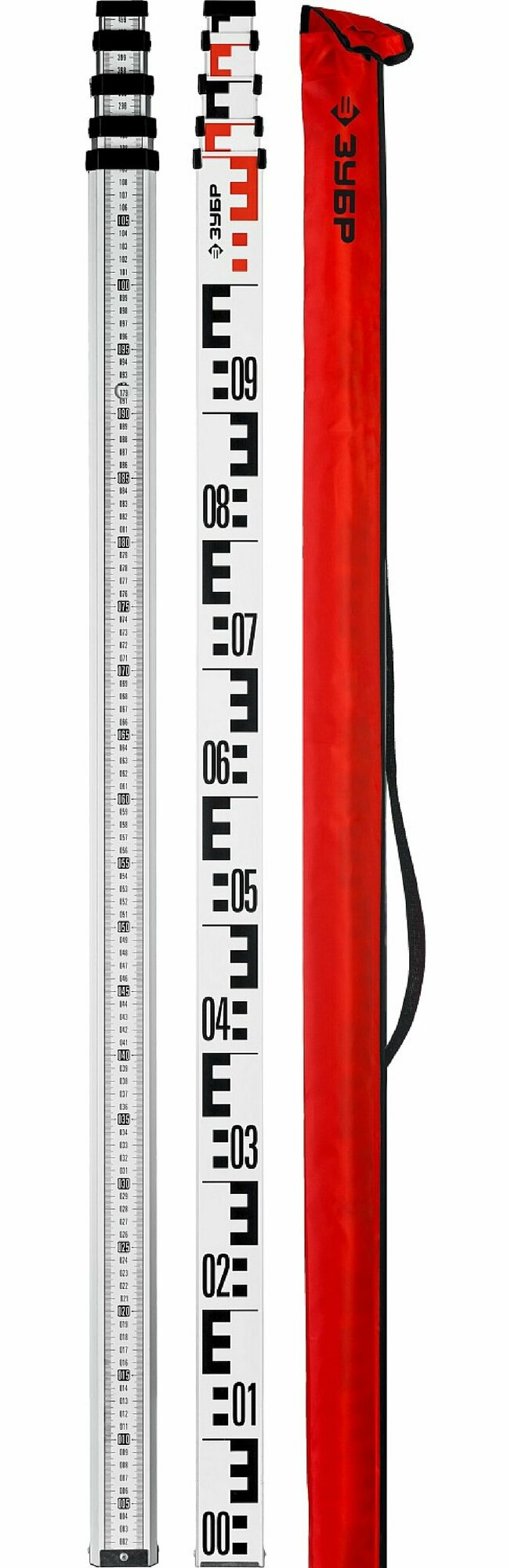 Рейка геодезическа ЗУБР РГ 5 34948-5 профессиональный инструмент для работы с лазерным оптическим инструментом для определения перепадов высоты. Имеет миллиметровую шкалу и E-градуировку. Изготовлена из лёгкого и прочного алюминиевого сплава.