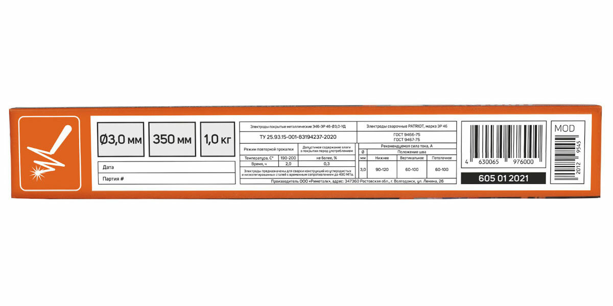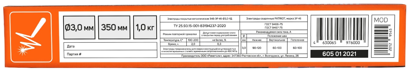 Электроды Patriot ЭР 46, диаметр 3мм, длина 350мм, Рутиловое покрытие (605012021)