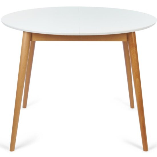 Стильный обеденный стол BOSCO из Датской коллекции отлично дополнит интерьер загородного дома, городской квартиры, кухни, гостиной, кафе или ресторана. Удачное сочетание столешницы, покрашенной в белый цвет, и визуально легких ножек цвета натурального дерева выглядит стильно и привлекательно. Обеденный стол BOSCO хорошо впишется в любой современный интерьер. Модель имеет основательный раздвижной механизм, который позволит разместить с комфортом всю вашу семью. Круглая форма столешницы помогает создать свободную и легкую атмосферу в комнате, способствует спокойному и приятному общению. Изящные тонкие ножки изготовлены из натуральной экологически чистой древесины - массива бука. Столешница из МДФ со шпоном бука и глянцевым напылением не требует специального ухода, выдерживает воздействие жидкости и тепла. Стол поставляется в разобранном виде, необходима несложная сборка по инструкции.