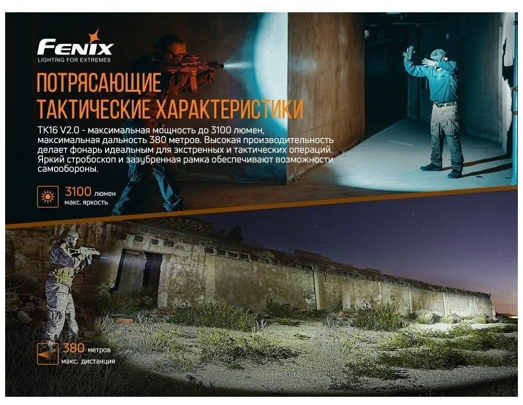 Fenix TK16 относится к тактической серии и может быть использован в качестве подствольного фонаря. В качестве ручной модели, этот фонарь будет полезен охотникам, туристам, рыбакам и другим любителям отдыхать на природе активно. Максимально возможная для Fenix TK16 яркость составляет 1000 люмен. Особенности: яркость освещения составляет 1000 люмен; интегрированный диодCree XM-L2 U2; работа на одном аккумуляторе формата 18650; возможность использования батареек стандарта CR123A; механизм запоминания последнего установленного режима яркости; фонарь совместим с большим количеством аксессуаров; дизайн корпуса способствует высокой степени защиты от вибрации, отдачи, ударов; интерфейс управления представлен двумя кнопками; корпус фонаря сделан из анодированного алюминиевого сплава; модель соответствует требованиям стандарта IPX-8 относительно защищенности от воды и пыли.