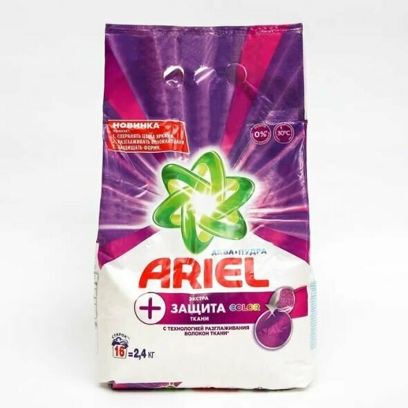 Стиральный порошок Ariel Аквапудра Color для цветного белья. Порошок для стирки Ariel Аквапудра Color для цветных тканей превосходно и бережно отстирывает загрязнения на одежде даже в холодной воде, и дарит белью приятный аромат свежести. Безупречная чистота и приятный аромат одежды дарят прекрасное настроение и уверенность в себе, поэтому очень важно уделять должное внимание стирке. Именно для этого мы создали стиральный порошок Ариэль Аквапудра для цветного белья. Благодаря новой технологии, Ариель Аквапудра растворяется, едва коснувшись воды, и моментально активируется: удаляет трудновыводимые пятна, глубоко проникая в структуру волокон, и не дает загрязнениям въедаться. Порошок устраняет загрязнения, вызывающие неприятные запахи, такие как запах пота и тела, придавая одежде сияющую чистоту даже на воротничках и манжетах рубашек, и не оставляя следов и разводов. Предпочитаете более мягкие ароматы? Обратите внимание на коллекцию Ariel Масло Ши. Для наилучших результатов стирки мы рекомендуем попробовать наши лучшие стиральные порошки – премиальную линейку Ariel Extra: Ariel Oxi Effect поможет справиться с самыми сложными пятнами благодаря эффекту пятновыводителя в составе, а Ariel Extra Защита Цвета поможет надолго сохранить яркость цветой и форму одежды благодаря технологии разглаживания волокон. Преимущества Ariel Аквапудра: - Безупречное удаление пятен с первой стирки даже при 20°C - Порошок быстро растворяется, не оставляя следов и разводов на одежде - Сохраняет яркость цветных вещей на длительный срок - Помогает справиться с застарелыми пятнами - Не дает грязи и пятнам въедаться в структуру волокон - Ariel Color также предлагается в форме геля для стирки и капсул PODs Всё-в-1 Для большего эффекта используйте кондиционер для белья Lenor: он обеспечивает мягкость белья и защищает одежду от появления катышков, потери формы и потери цвета. Теперь ваши любимые вещи прослужат вам еще дольше. Безопасность превыше всего! Наши стиральные средства не содержат фосфаты или хлор.