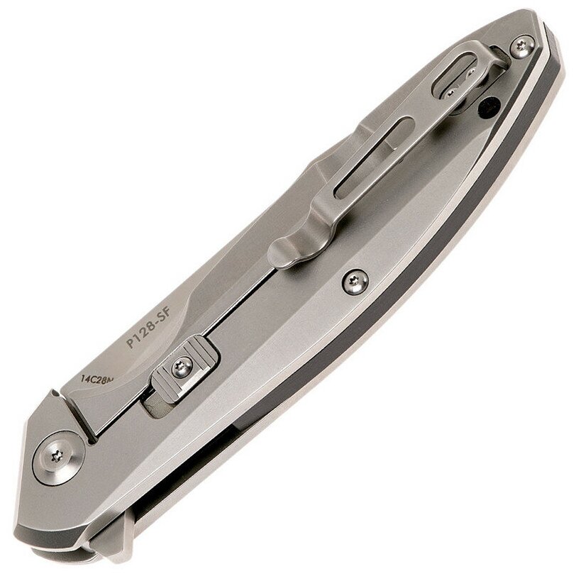 На рукоятке уже прикручена клипса, которая нужна, чтобы нож можно было носить прямо на ремне. Ее положение фиксированное. Также с той стороны, где прикручена клипса, хорошо видно, что часть рукоятки одновременно является прижимной пластиной в замке Frame Lock. Это модифицированный блокирующий механизм, который нужен для регулировки положения клинка. Пластина упирается в пятку лезвия, не давая ему сложиться во время работы с ножом. Это делает эксплуатацию ножа практически полностью безопасной. Производители предусмотрели даже дополнительный фиксирующий механизм - Safety Lock, что делает данную модель гораздо более надежной даже по сравнению со многими хорошо известными своим высоким качеством моделями.