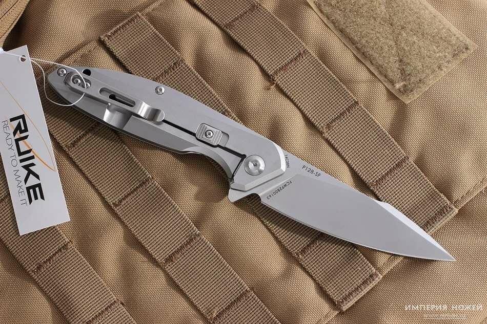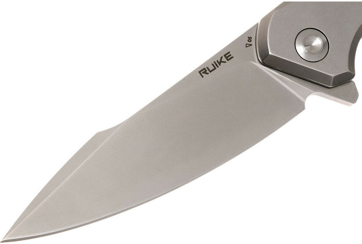 Ножи бренда Ruike очень удачно объединяют современный дизайн с классической надежностью этих инструментов. Они изготовлены из очень надежных материалов, а все детали выполнены аккуратно и точно. Не удивительно, что модель за короткое время после появления на рынке, приобрела большую популярность. Лезвие данного ножа имеет необычную форму и напоминает одновременно drop-point и классическую финку. Режущая кромка сделана гладко заточенной и завершается острием, которое помогает делать действительно точные разрезы. Длина клинка составляет 93 мм, тем не менее, данная модель не входит в категорию холодного оружия, в подтверждение чего имеется соответствующий сертификат. Толщина клинка этого складного ножа достигает 3,5 мм. Лезвие не только отлично служит своему владельцу, но и требует совершенно простого ухода за собою, ведь сделано оно из нержавеющей стали. Производители специально взяли сплав высокой твердости 14C28N, который прекрасно держит заточку после криозакалки до твердости 58-60 HRC. Еще одной узнаваемой ертой данной модели является то, что лезвие сделано практически матовым за счет особой шлифовки металла. Эта техника называется Bead Blasted и подразумевает использование мелких стеклянных шариков, которые, ударяясь о поверхность металла, оставляют на ней микро следы, которые в итоге и дают матовый эффект.
