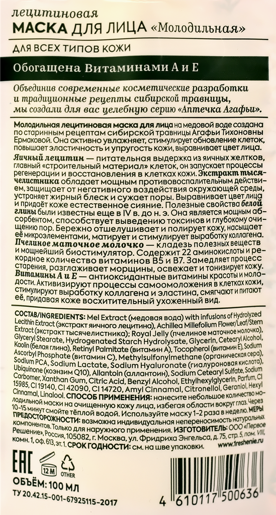 Увлажняющая гель-маска для лица. Объединив современные косметические разработки и традиционные рецепты сибирской травницы, мы создали для вас целебную серию Аптечка Агафьи.