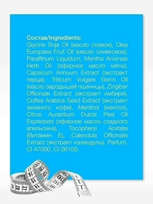| Состав | glycine soja oil (масло соевое), olea europaea fruit oil (масло оливковое), paraffinum liquidum, mentha arvensis herb oil (эфирное масло мяты), capsicum annuum extract (экстракт перца), triticum vulgare germ oil (масло зародышей пшеницы), zingiber officinale extract (экстракт имбиря), coffea arabica seed extract (экстракт зеленого кофе), menthol (ментол), citrus aurantium dulcis peel oil expressed (эфирное масло сладкого апельсина), tocopheryl acetate (витамин е), calendula officinalis extract (экстракт календулы), parfum, ci 47000, ci 26100 |