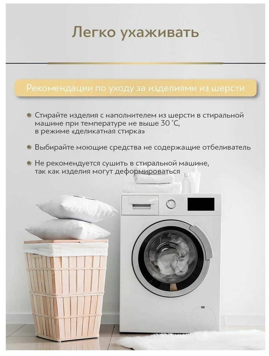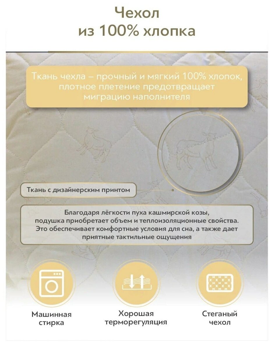 Благодаря своим уникальным лечебным свойствам, кашемир — один из самых высокоценных волокон в мире. Подушки, наполненные натуральной козьей шерстью, можно использовать в любой сезон. Этот материал обладает эффектом терморегуляции, что поддерживает естественную температуру тела. Достоинства наполнителя из шерсти гималайской кашмирской козы: необычайная мягкость, легкость и шелковистость изделий; прекрасно сохраняет тепло и пропускает воздух; помогает расслабиться; благоприятно воздействует на мышцы и суставы.
