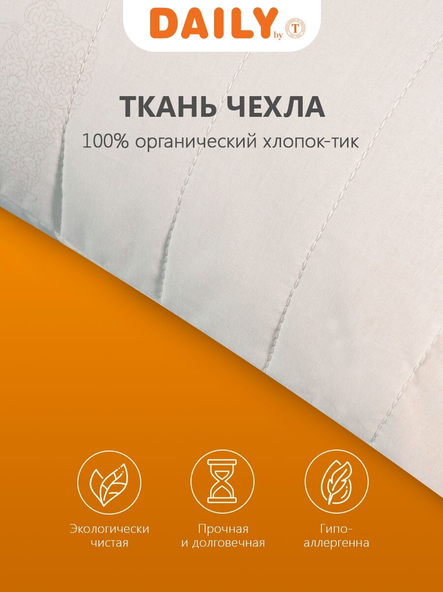 Изделие обладает хорошей терморегуляцией для комфортного сна и отдыха в любое время года, будь то зима или лето, осень или весна. Чехол для подушки изготовлен из прочной и долговечной ткани тик, обладающей хорошей воздухопроницаемостью. Подушка подходит для сна на боку, спине и животе.