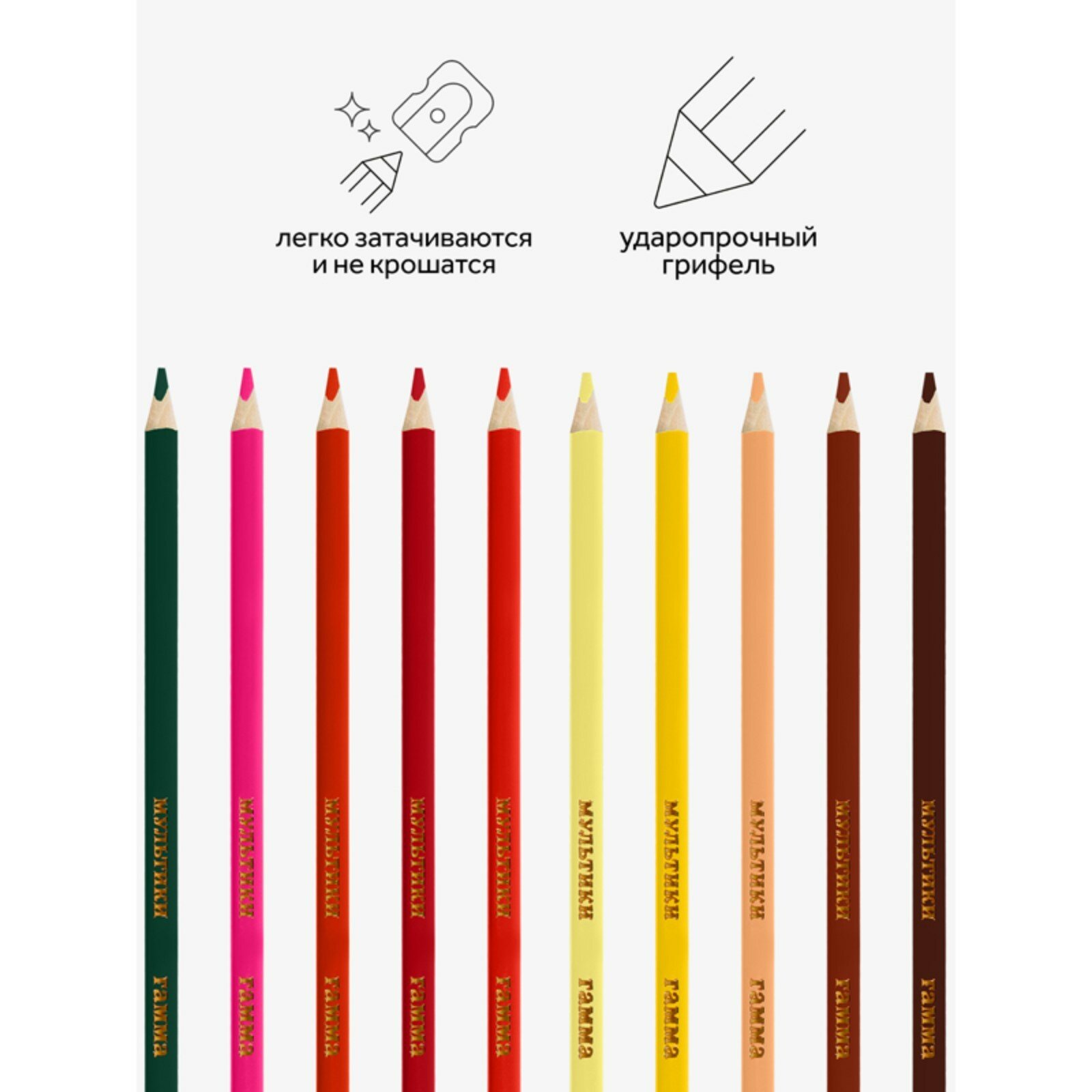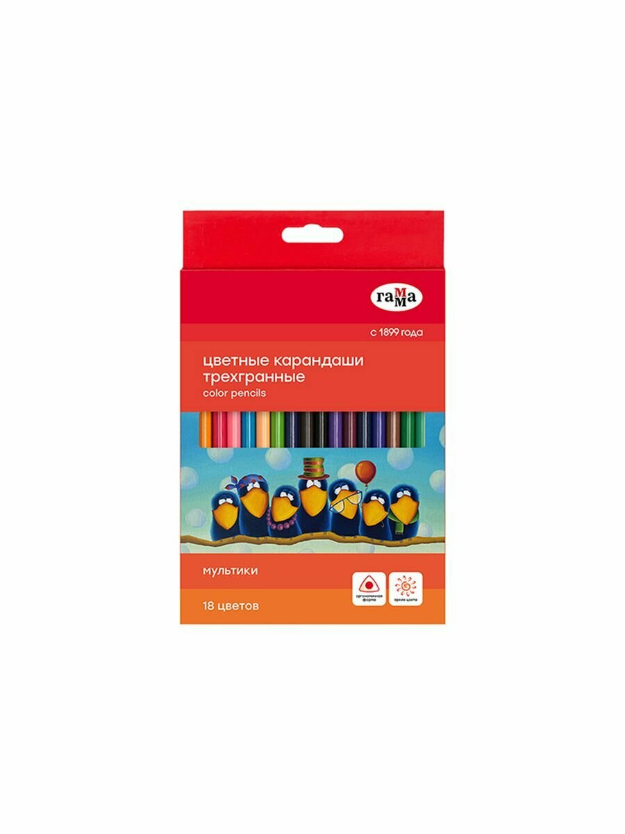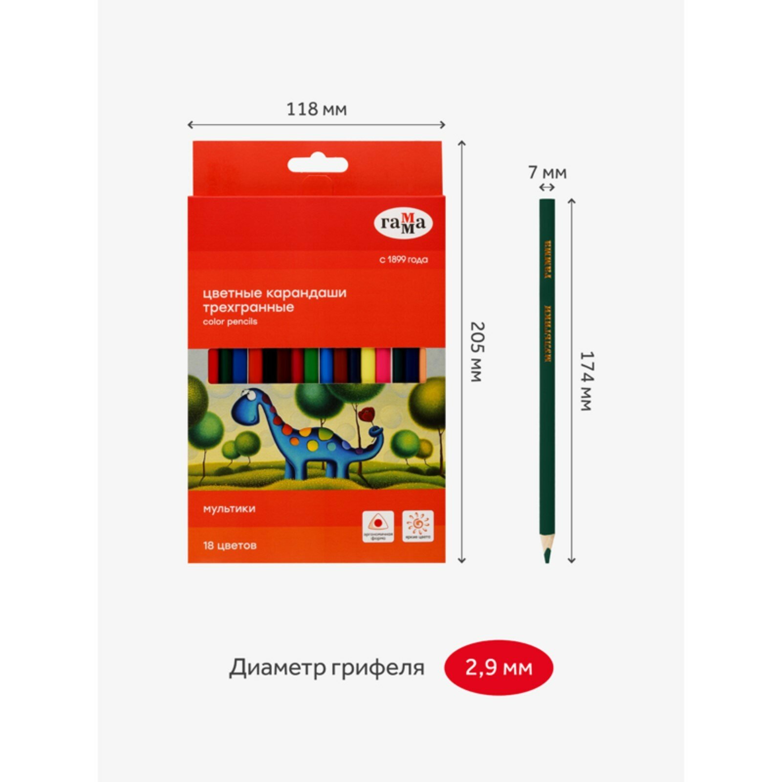 Цветные карандаши ГАММА серии Мультики выполнены в эргономичном трехгранном корпусе, который подскажет ребенку, как правильно держать инструмент во время творческих занятий. В наборе 18 цветов. Диаметр грифеля 2,9 мм. Проклеенный ударопрочный грифель не крошится во время заточки и не ломается даже после падения. Корпус карандаша диаметром 7 мм и длиной 174 мм изготовлен из дерева. Специальная обработка древесины позволяет легко заточить карандаш без зазубрин и заноз. За яркость и высокую укрывистость отвечают качественные пигменты в составе. Ребенку не придется сильно давить на карандаш рисунок получится ярким и равномерно закрашенным.