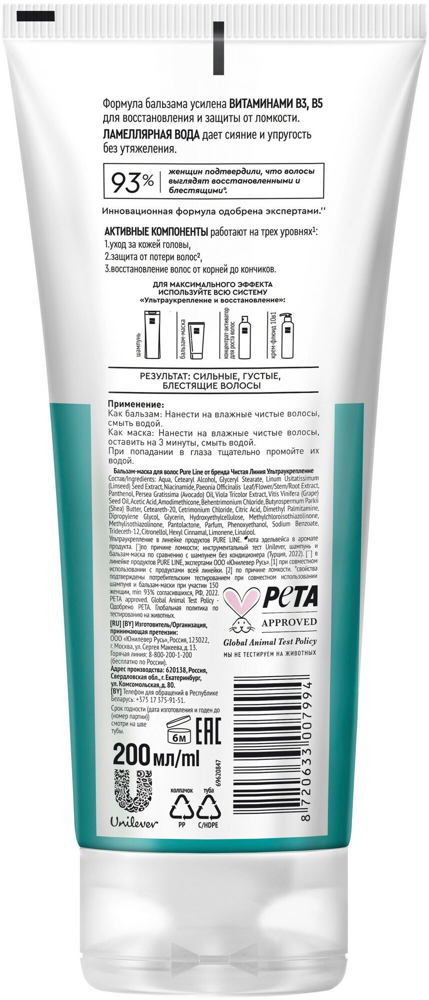 Для сильных и ухоженных волос попробуйте бальзам-маску Ультраукрепление Pure Line от бренда Чистая Линия. Формула продукта усилена витаминами В3, B5 для восстановления и защиты от ломкости. Ламеллярная вода дает сияние и упругость без утяжеления. Инновационная формула одобрена экспертами. Продукт может быть использован как бальзам и как маска. Не утяжеляет волосы и подходит для ежедневного применения.