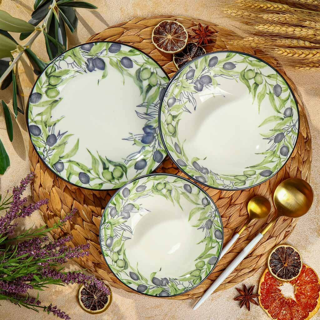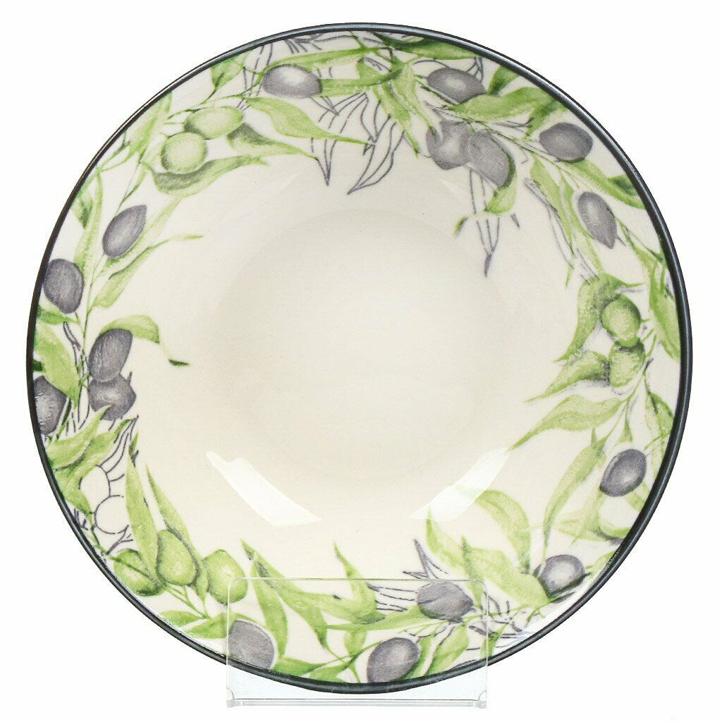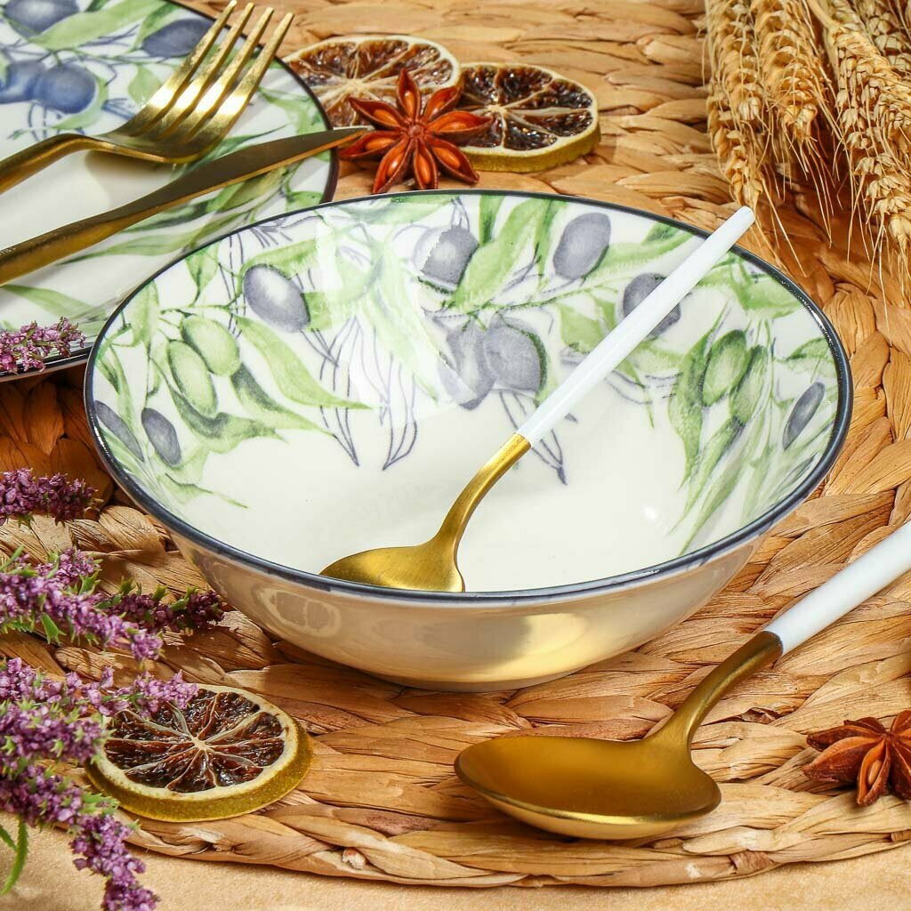 Салатник из коллекции фарфоровой посуды "Оливки". На изделии изображены плоды и цветы оливкового дерева. Диаметр салатника 15 см, высота 5 см, литраж 350 мл. Салатник можно использовать в посудомоечной машине и СВЧ. Сделано в Китае.