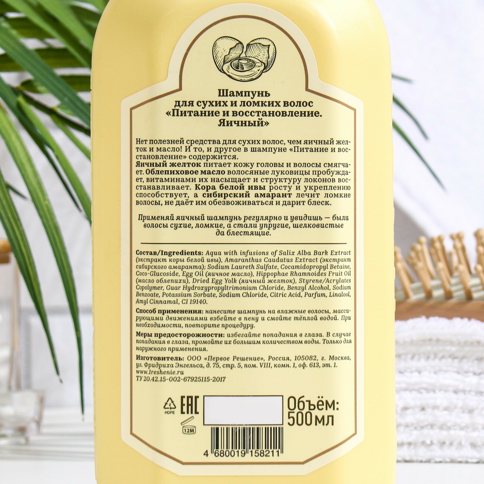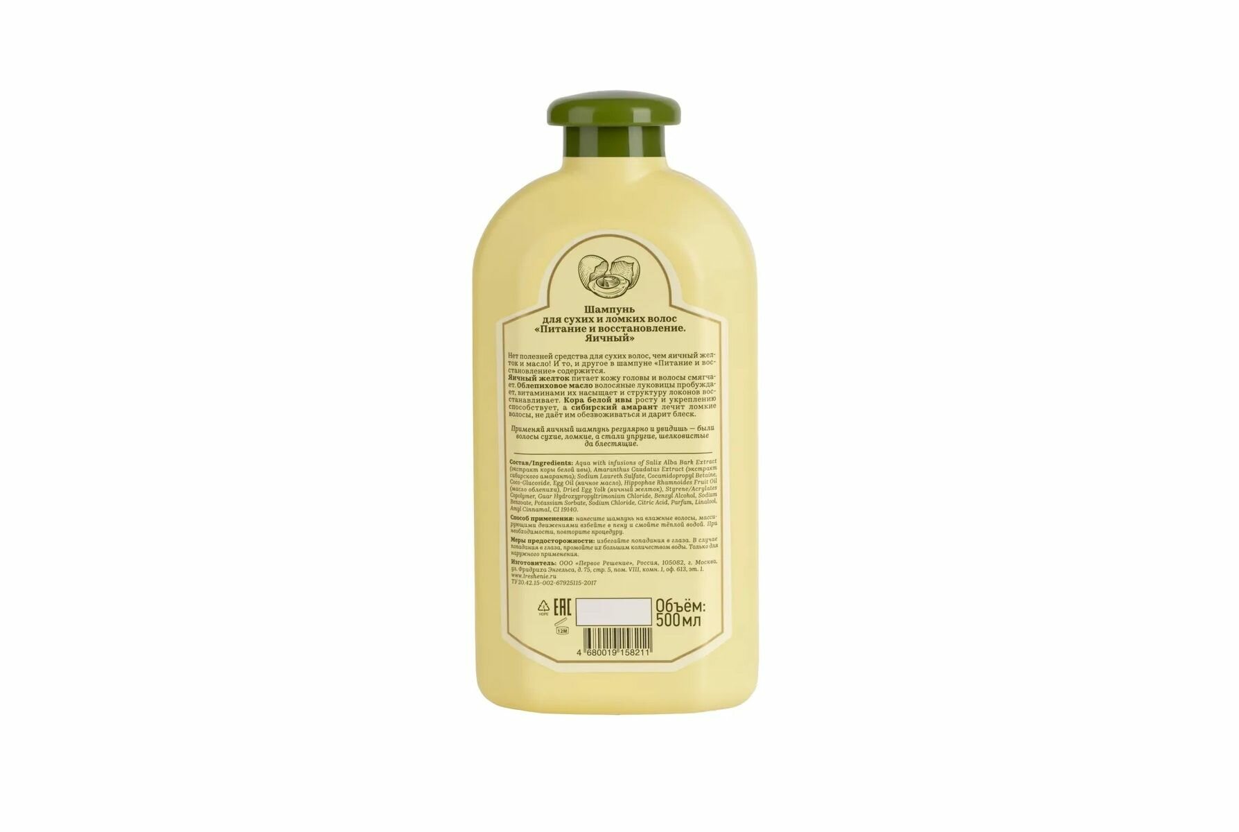 | Состав | Aqua with infusions of Salix Alba Bark Extract (экстракт коры белой ивы), Amaranthus Caudatus Extract (экстракт сибирского амаранта) Sodium Laureth Sulfate, Cocamidopropyl Betaine, Coco-Glucoside, Egg Oil (яичное масло), Hippophae Rhamnoides Fruit Oil (масло облепихи), Dried Egg Yolk (яичный желток), Styrene/Acrylates Copolymer, Guar Hydroxypropyltrimonium Chloride, Benzyl Alcohol, Sodium Benzoate, Potassium Sorbate, Sodium Chloride, Citric Acid, Parfum, Linalool, Amyl Cinnamal, CI 19140 |