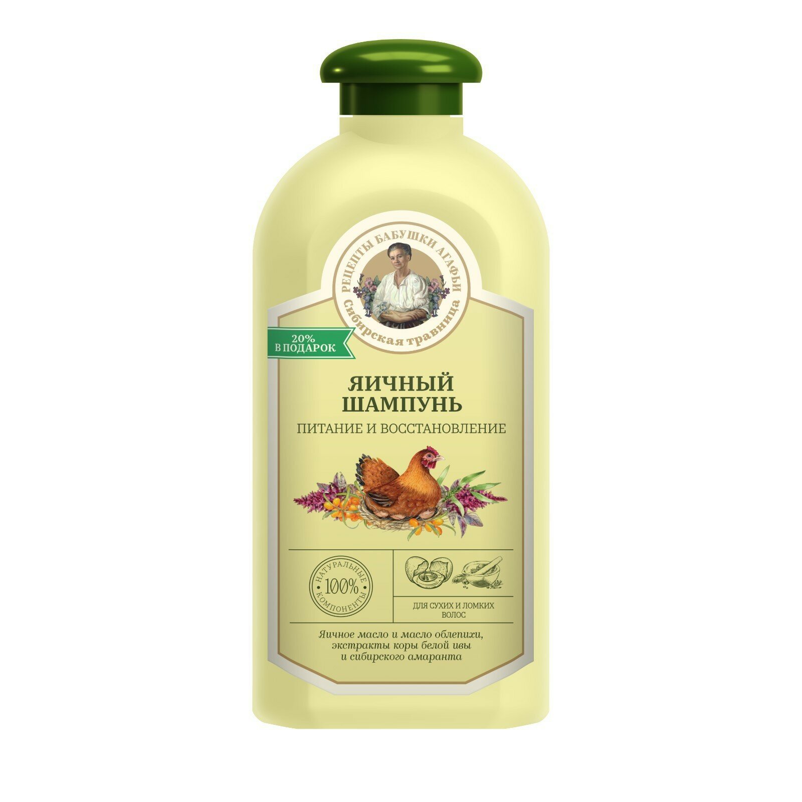 Нет полезней средства для сухих волос, чем яичный желток и масло! И то, и другое в шампуне Питание и восстановление содержится. Яичный желток питает кожу головы и волосы смягчает. Облепиховое масло волосяные луковицы пробуждает, витаминами их насыщает и структуру локонов восстанавливает. Кора белой ивы росту и укреплению способствует, а сибирский амарант лечит ломкие волосы, не даёт им обезвоживаться и дарит блеск. Применяй яичный шампунь регулярно и увидишь были волосы сухие, ломкие, а стали упругие, шелковистые да блестящие.