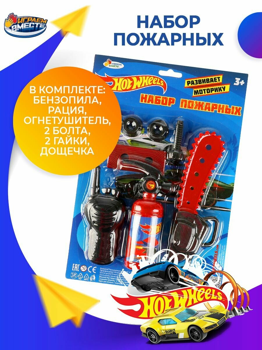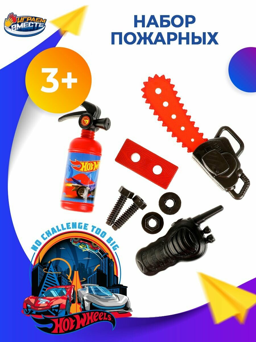 Игровой набор пожарных Hot Wheels ТМ Играем вместе понравится маленькому герою. В комплекте: огнетушитель, пила, рация, 2 гайки, 2 болта. В этом наборе есть все необходимое для подвигов юного спасателя. Играя с ним, ребенок сможет придумать много новых увлекательных игровых сюжетов. Игра с набором ТМ Играем вместе развивает: воображение и фантазию, пространственное ориентирование, моторику.
