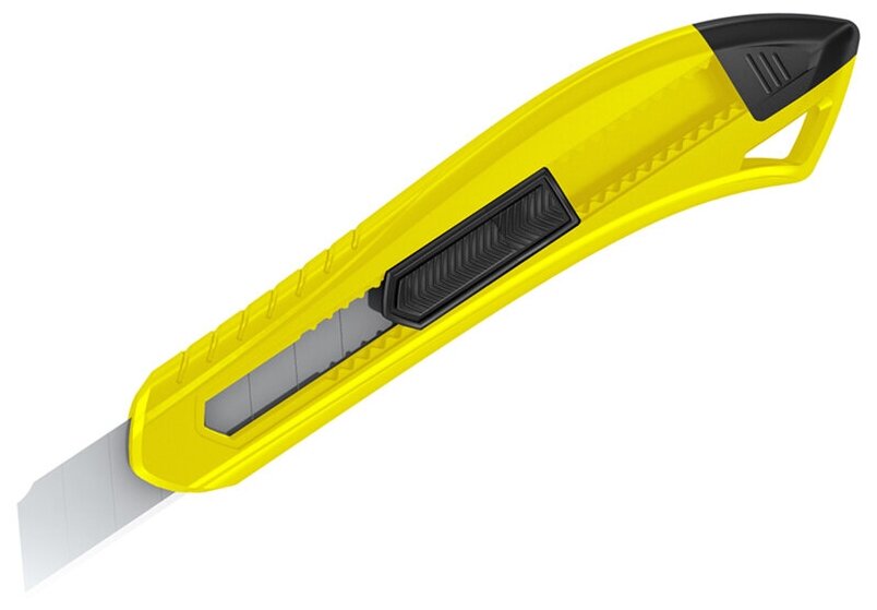Серия "Razzor 100". Нож канцелярский с ручной системой фиксации лезвия push-lock. Корпус ножа выполнен из высококачественного ABS пластика. Комплектуется износостойким лезвием из стали SK5. Ширина лезвия - 18 мм. Индивидуальная упаковка - пакет с европодвесом. Доступен в трех цветах: желтый, черный, синий. Товар представлен в ассортименте без возможности выбора модели!