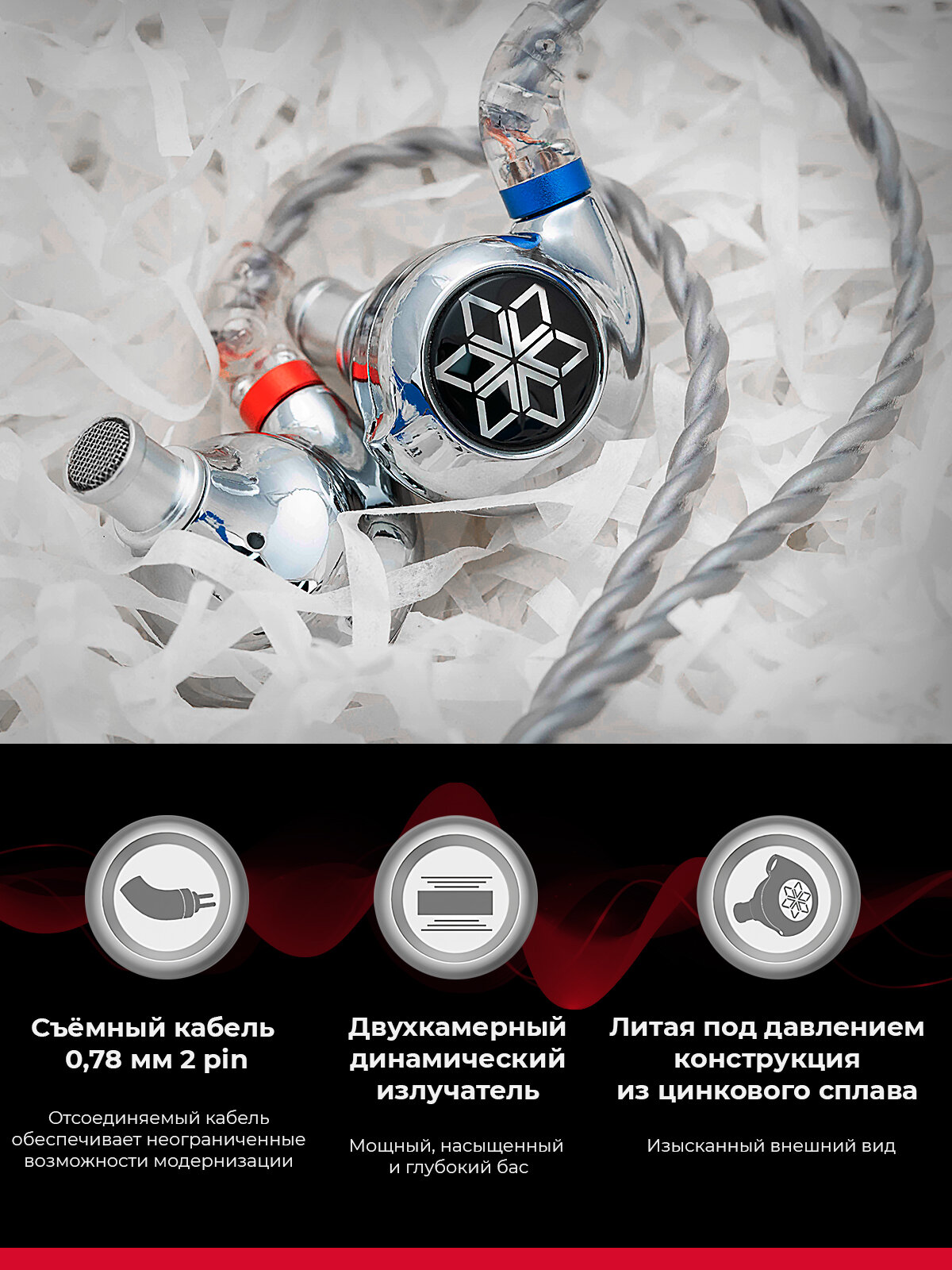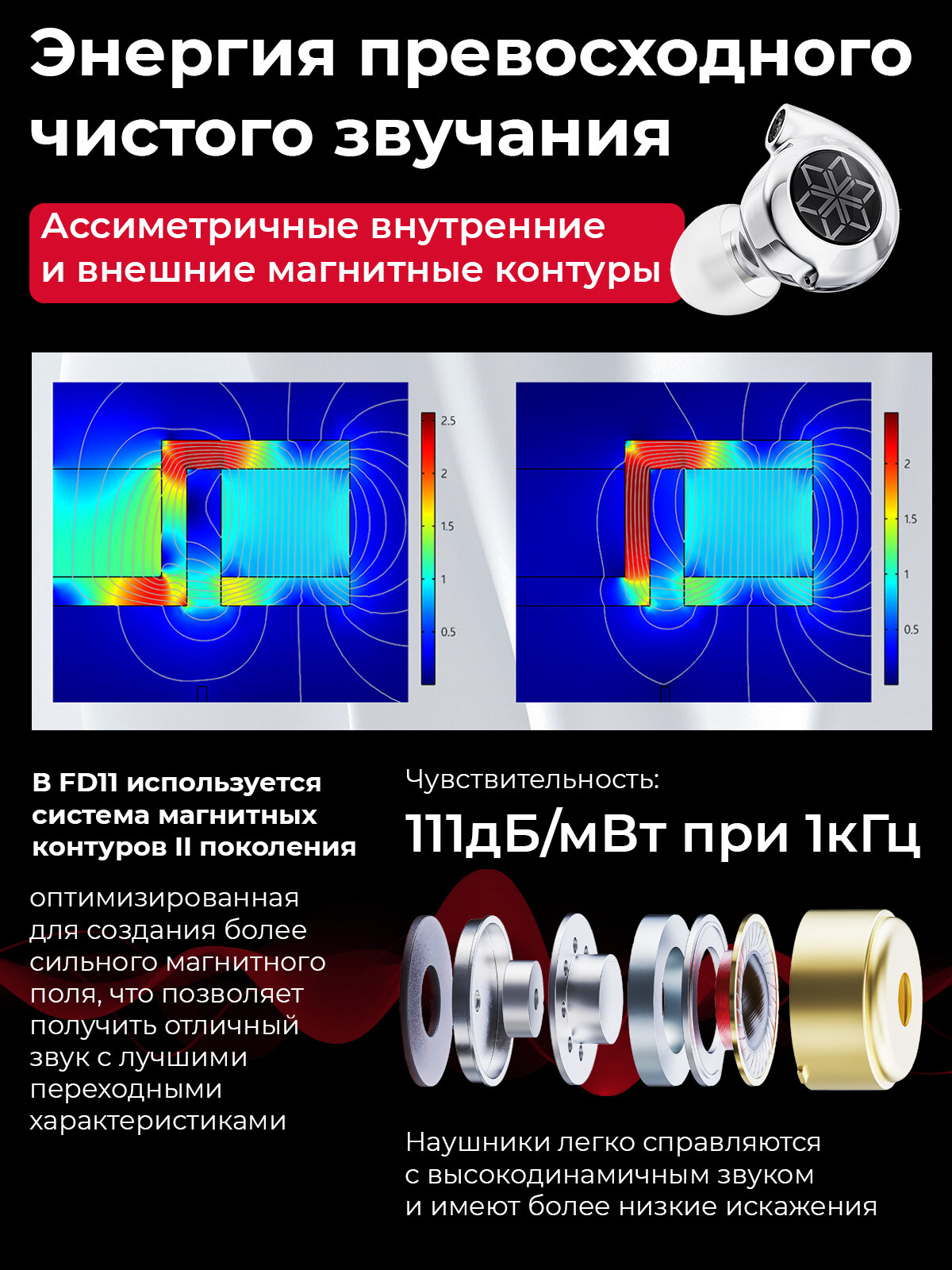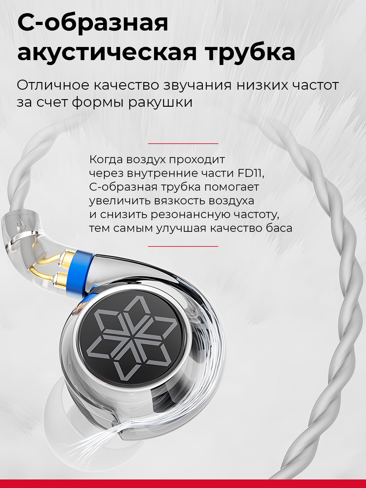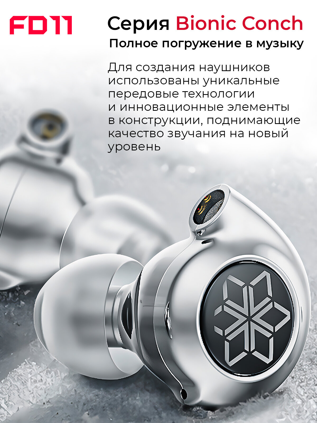 FiiO FD11 — динамические наушники с 10-мм карбоновым драйвером. Материалы уровня High-End и использование инновационных технологий ставят эти наушники на вершину своего класса по качеству звучания и визуальной эстетике. Команда разработки FiiO создала FD11 в рамках новой серии Bionic Conch (Бионическая раковина), нацеленной на звучание и эстетику, превосходящие свою ценовую категорию. Использование премиальных материалов и технологий позволило поднять звук на новый уровень и подарить слушателю уникальные ощущения от любимой музыки. Для излучателей FD11 разработчики выбрали те же материалы, что и у топовых моделей FiiO FH15 и FF5 — 10-мм диафрагма на основе углерода легче, чем алюминиевые и бериллиевые аналоги, но при этом в 9 раз более прочная, чем сталь. В FD11 реализована фирменная ассиметричная магнитная система второго поколения с внешней и внутренней частями схемы. Двойная магнитная система спроектирована с помощью моделирования методом конечных элементов и по эффективности и плотности магнитного потока превосходит стандартные (внешние или внутренние) магнитные системы драйверов. Использование магнитов из неодима N52 позволило достигнуть высокой чувствительности в 111 дБ/мВт и снизить до минимума уровень искажений. Позади динамиков FD11 инженеры расположили специальную двойную резонаторную камеру с системой демпфирования, распределяющей воздушный поток между внутренней и внешней камерами. Это позволяет, диафрагме двигаться более свободно и без риска повреждения. Также снижаются искажения от отраженных волн, в результате высокие частоты звучат более детально, а низкие — получают более точный, плотный и выраженный характер. Вдохновением для формы FiiO FD11 послужили морские раковины. Корпус изготовлен из цинкового сплава с помощью технологии литья под давлением, а затем отполирован и гальванизирован для придания финального блеска. В результате чего FD11 получили высококлассный внешний вид и прочный, износоустойчивый корпус, готовый к ежедневному использованию. На звучании всё это тоже отразилось в лучшую сторону — технология производства позволяет получить немного неровную внутреннюю поверхность — достаточную для того, чтобы минимизировать возникновение стоячих волн и сделать звучание еще чище. FD11 — отличный пример того, что можно получить, соединив эстетику и технологичность.