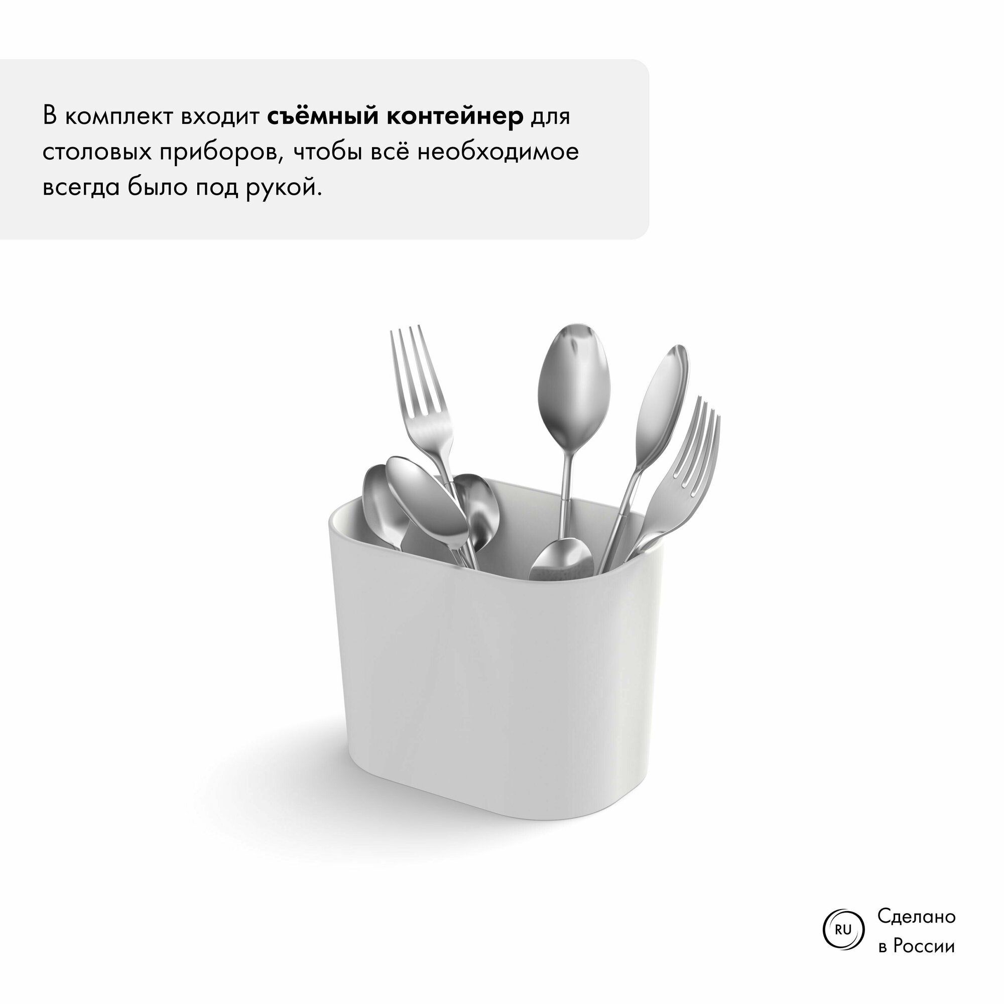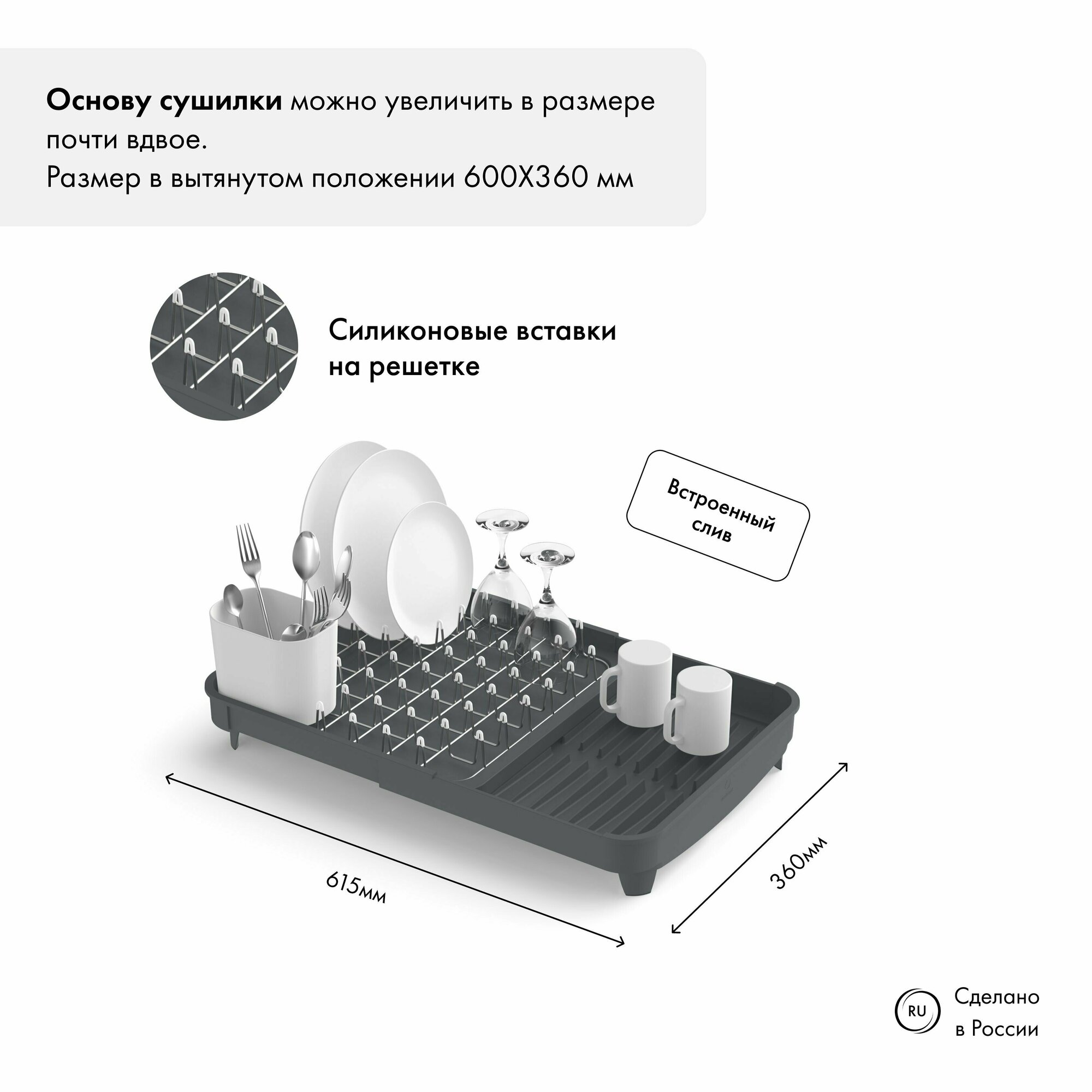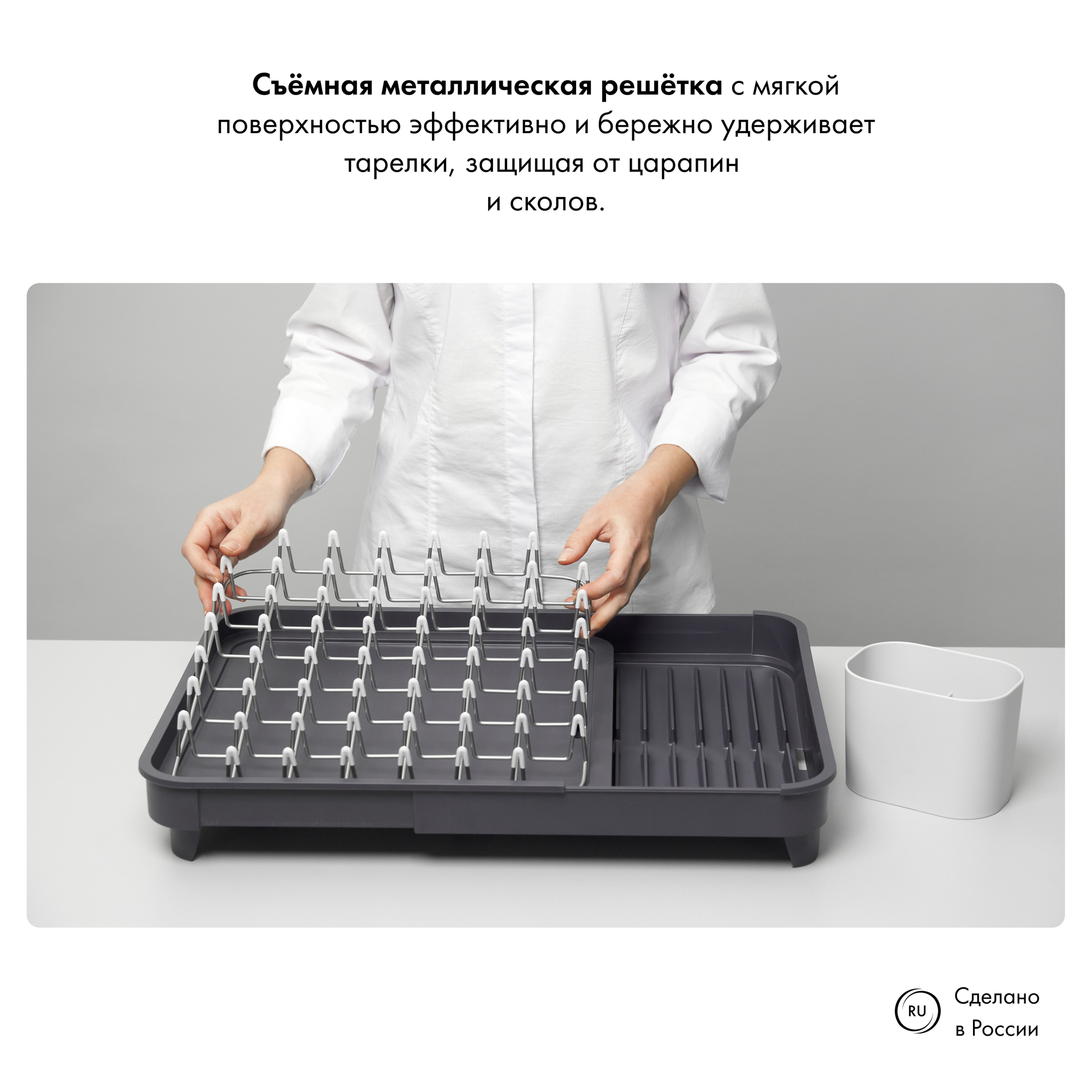 Сушилка для посуды Omni идеальное решение для любой кухни. Съёмная металлическая решётка с мягкой поверхностью эффективно и бережно удерживает посуду, защищая от царапин и сколов.В комплект входит съёмный контейнер для столовых приборов, чтобы все необходимое всегда было под рукой. Излишки воды уходят через встроенный слив. Основа сушки раздвигается легким движением. Имеет противоскользящие ножки. Можно мыть в посудомоечной машине.