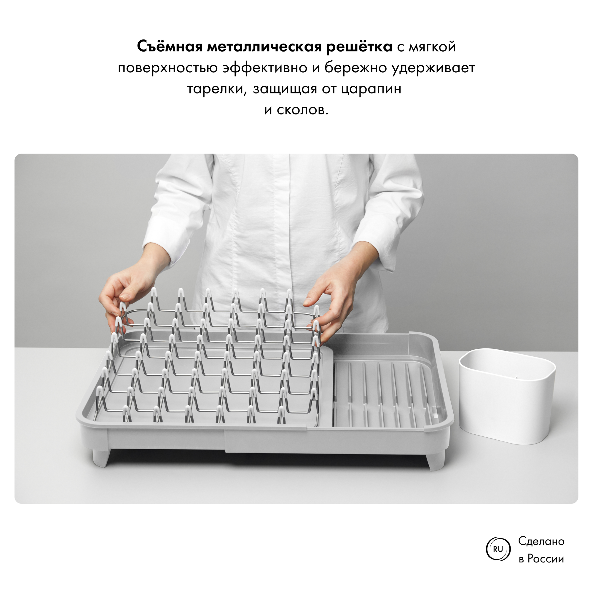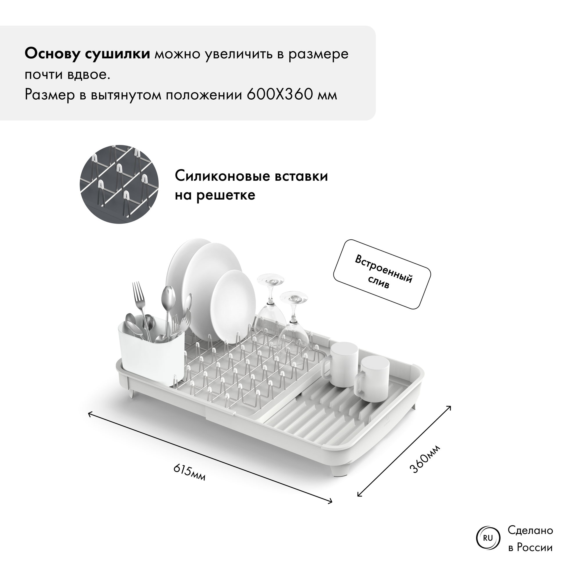 Сушилка для посуды Omni идеальное решение для любой кухни. Съёмная металлическая решётка с мягкой поверхностью эффективно и бережно удерживает посуду, защищая от царапин и сколов.В комплект входит съёмный контейнер для столовых приборов, чтобы все необходимое всегда было под рукой. Излишки воды уходят через встроенный слив. Основа сушки раздвигается легким движением. Имеет противоскользящие ножки. Можно мыть в посудомоечной машине.