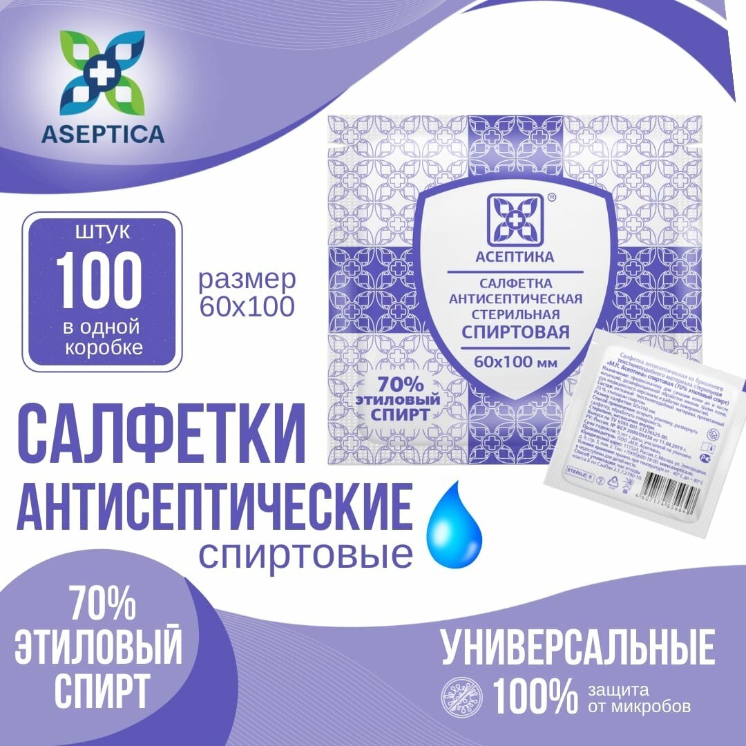 Салфетка спиртовая антисептическая стерильная из нетканного материала 60 мм х 100 мм 100 шт. АСЕПТИКА