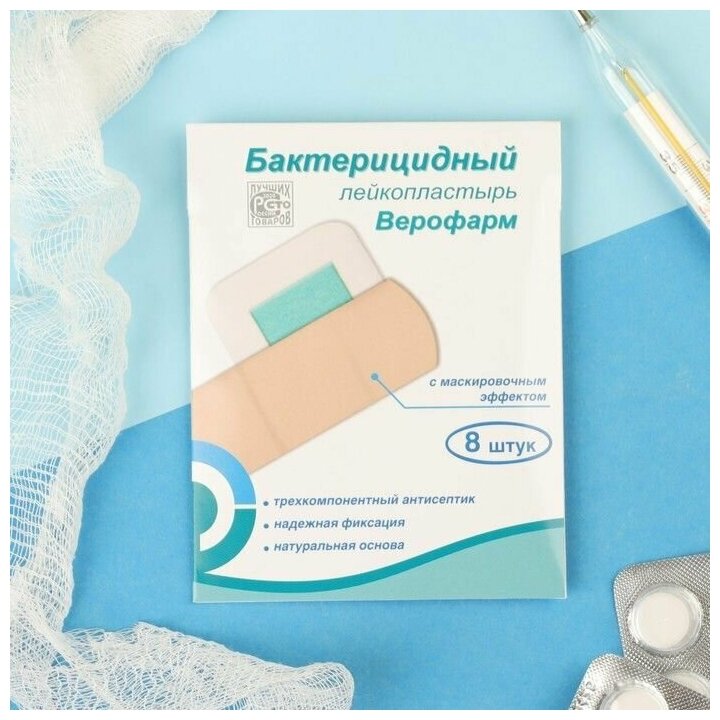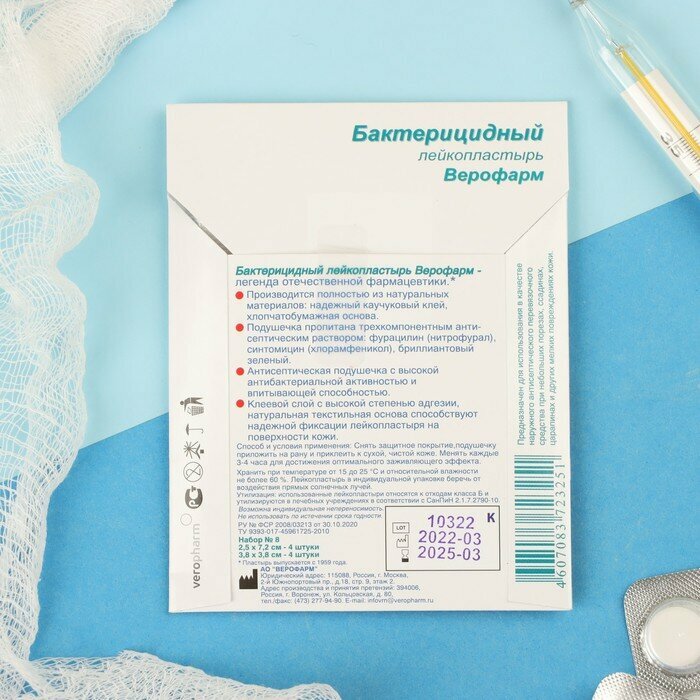 Лейкопластырь бактерицидный Верофарм - это набор из восьми лейкопластырей бежевого цвета и разных размеров (2,5х7,2 см — 4 шт.; 3,8х3,8 см — 4 шт.) Каждый лейкопластырь пропитан антисептическим раствором, который помогает предотвратить возникновение инфекций на месте раны (фурациллин, синтомицин, бриллиантовый зеленый). Этот набор очень удобен и практичен в использовании, так как каждый лейкопластырь имеет отдельную упаковку, что позволяет его легко взять с собой и использовать в любое время. Эти бактерицидные лейкопластыри Верофарм будут незаменимыми в любом доме или офисе, особенно если вы часто получаете мелкие повреждения кожи.