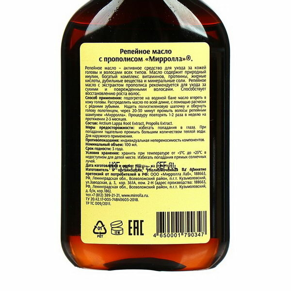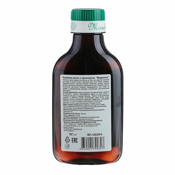Описание: Масло Репейное 100 мл прополис. Репейное масло – активное средство для ухода за кожей головы и волосами всех типов. Масло содержит природный инулин, богатый комплекс витаминов, протеины, жирные кислоты, дубильные вещества и минеральные соли. Репейное масло с экстрактом прополиса рекомендуется для ухода за сухими и поврежденными волосами. Способствует восстановлению роста волос. Избегать попадания в глаза. При попадании тщательно промыть большим количеством теплой воды. Для наружного применения. Arctium Lappa Root Extract, Propolis Extract. Избегать попадания в глаза. При попадании тщательно промыть большим количеством теплой воды. Для наружного применения. Без рецепта Хранить при температуре от +5°C до +25°C в недоступном для детей месте. Избегать попадания прямых солнечных лучей. 3 года.