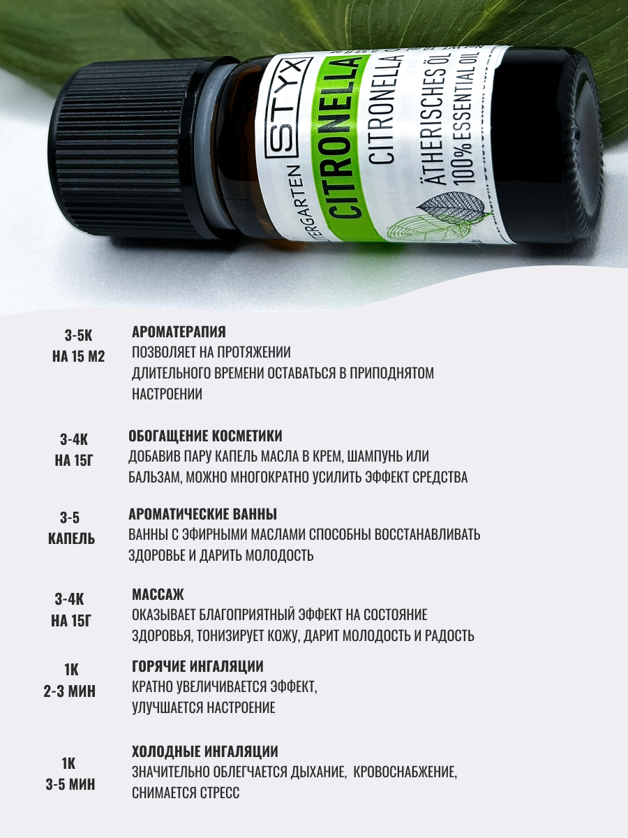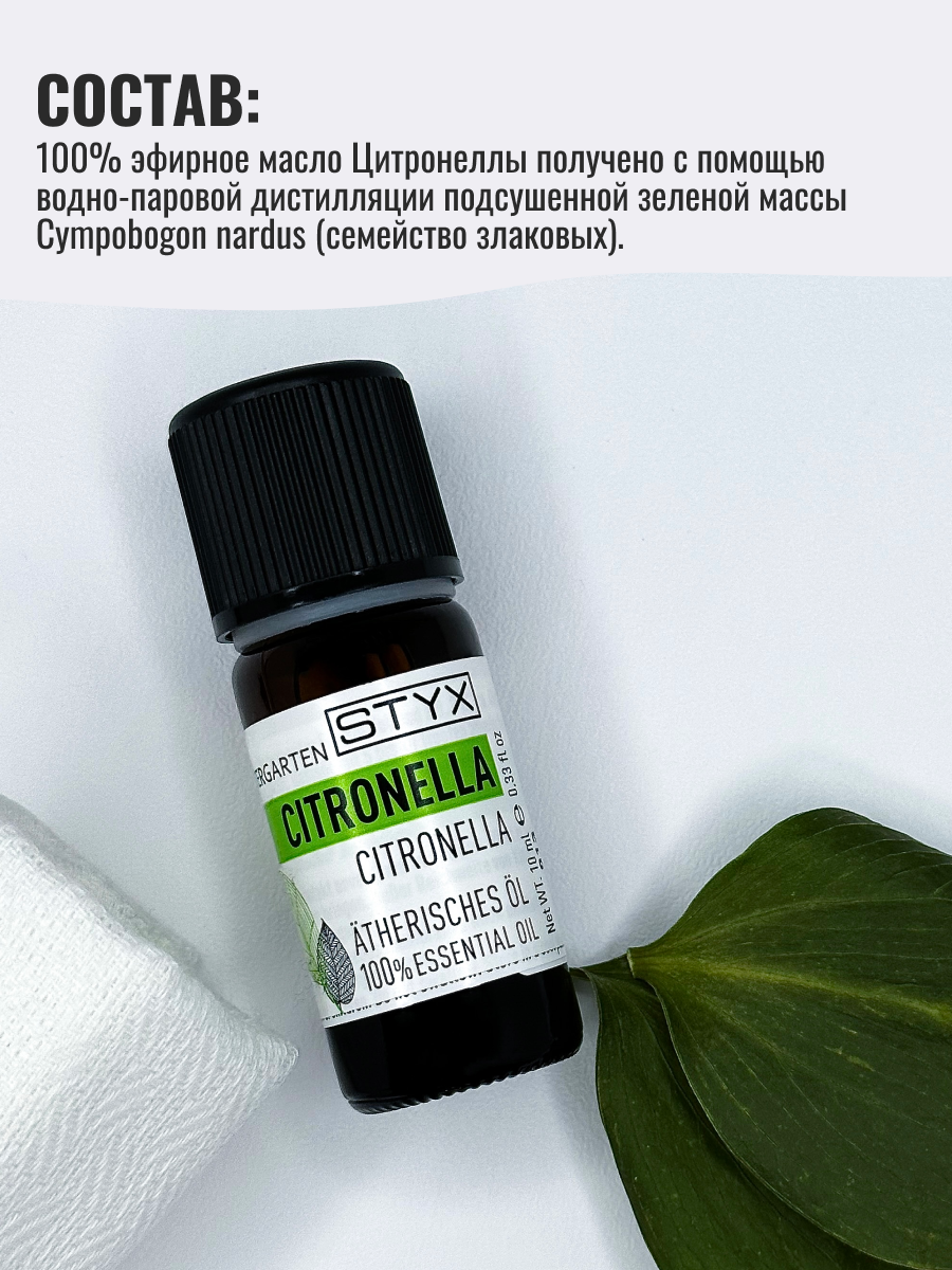 | Состав набора | Стикс Эфирное масло цитронелла 10мл |
