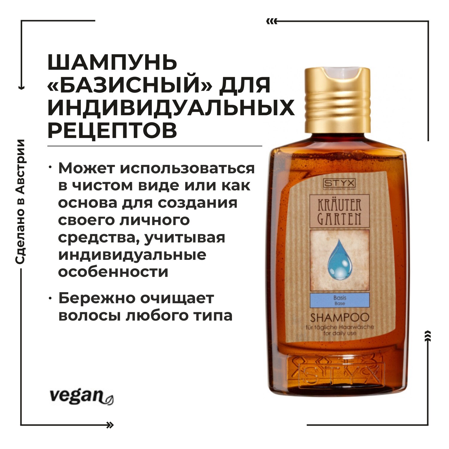 Шампунь "Базисный"– идеальная основа для создания своего личного средства, учитывая индивидуальные особенности. Бережно очищает волосы любого типа. Нежнейшая формула для бережного очищения волос любого типа содержит катионные, анионные, амфотерные (умное мыло), неионные ПАВ и натуральный увлажняющий фактор, деликатно очищая волосы и кожу, а также помогая целебным компонентам работать с волосами на клеточном уровне, нейтрализуя токсины и повреждающие факторы. Для мытья требуется мизерное количество шампуня ввиду его концентрированности (содержание воды менее 15%). Чтобы приготовить шампунь, учитывающий все индивидуальные особенности волос, в базисную основу добавляют эфирные масла до 30 к на 200 мл, которые в течение 2-3 мин создают иллюзию помутнения препарата (из-за разности индекса преломления света), но после встряхивания текстура снова становится прозрачной. Для стимуляции роста – розмарин, черный перец; При пересушенных волосах – ветивер; При повышенной жирности – мирт и грейпфрут; При жирной себорее – чайное дерево; При возрастной алопеции мужчинам – имбирь, женщинам – корица; Для повышения блеска – иланг-иланг, апельсин.