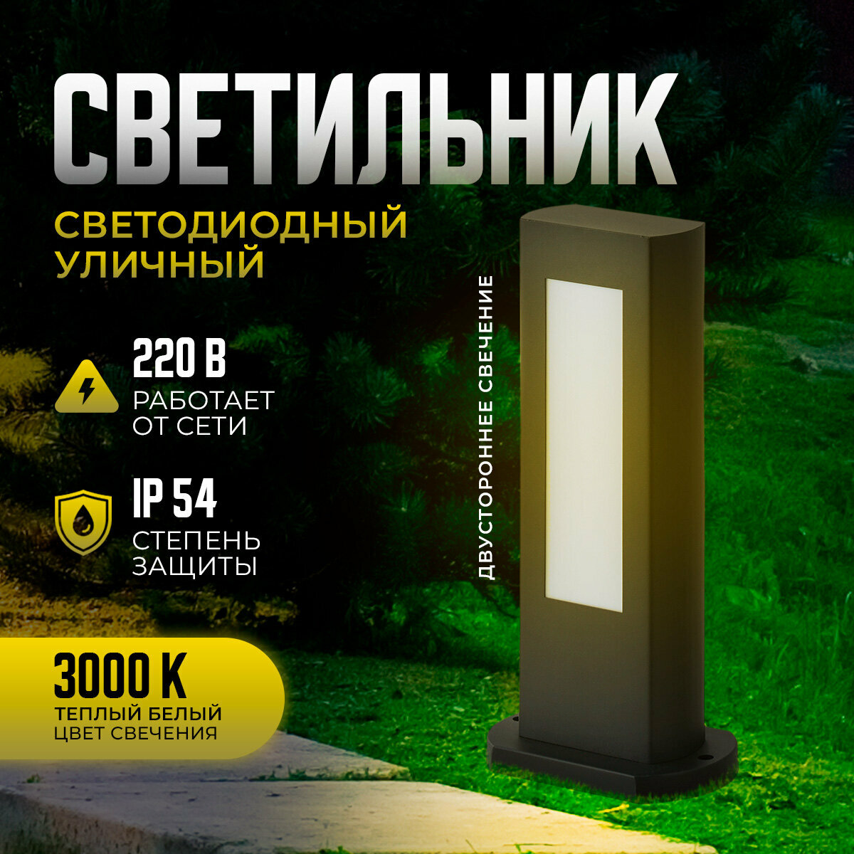 **Столб уличный светодиодный Apeyron** выполнен в современном стиле. Предназначен для общего и декоративного освещения дорожек парков, тротуара, газона, беседок, подсветки кустов и деревьев. Корпус светильника изготовлен из металла, а рассеиватель ― из поликарбоната. Материалы светильника показывают отличную устойчивость к механическим повреждениям, воздействию температуры и солнечного света. Матовый рассеиватель делает свечение мягким и комфортным. Корпус имеет классический черный цвет, который легко впишется в любую обстановку. Данное изделие имеет размер 100х50х300 мм и предназначено для монтажа на горизонтальную поверхность. Площадь освещения 2 м2. Источником свечения выступают светодиоды SMD 2835 с мощностью 9 Вт. Излучают световой поток равный 630 лм с цветовой температурой 3000 К – это цвет теплого предзакатного солнца. Угол светораспределения 2х120°. Светильник работает от сети 230 Вольт и не требует дополнительных устройств при подключении. В комплект входят 3 дюбеля и 3 винтовых самореза. Степень пылевлагозащиты изделия IP54.
