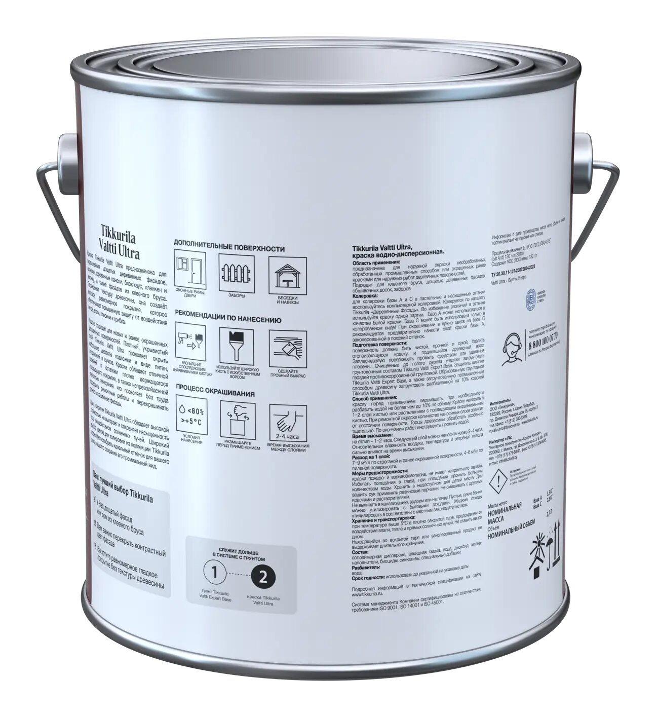 **Краска Tikkurila Valtti Ultra База А** используется для обработки деревянных фасадов. За счет входящего в состав натурального масла образует плотное белое матовое покрытие. Защищает основание от биопоражения. 1 л достаточно для обработки 7 м². Время высыхания составляет 4 часа как между слоями, так и полного.