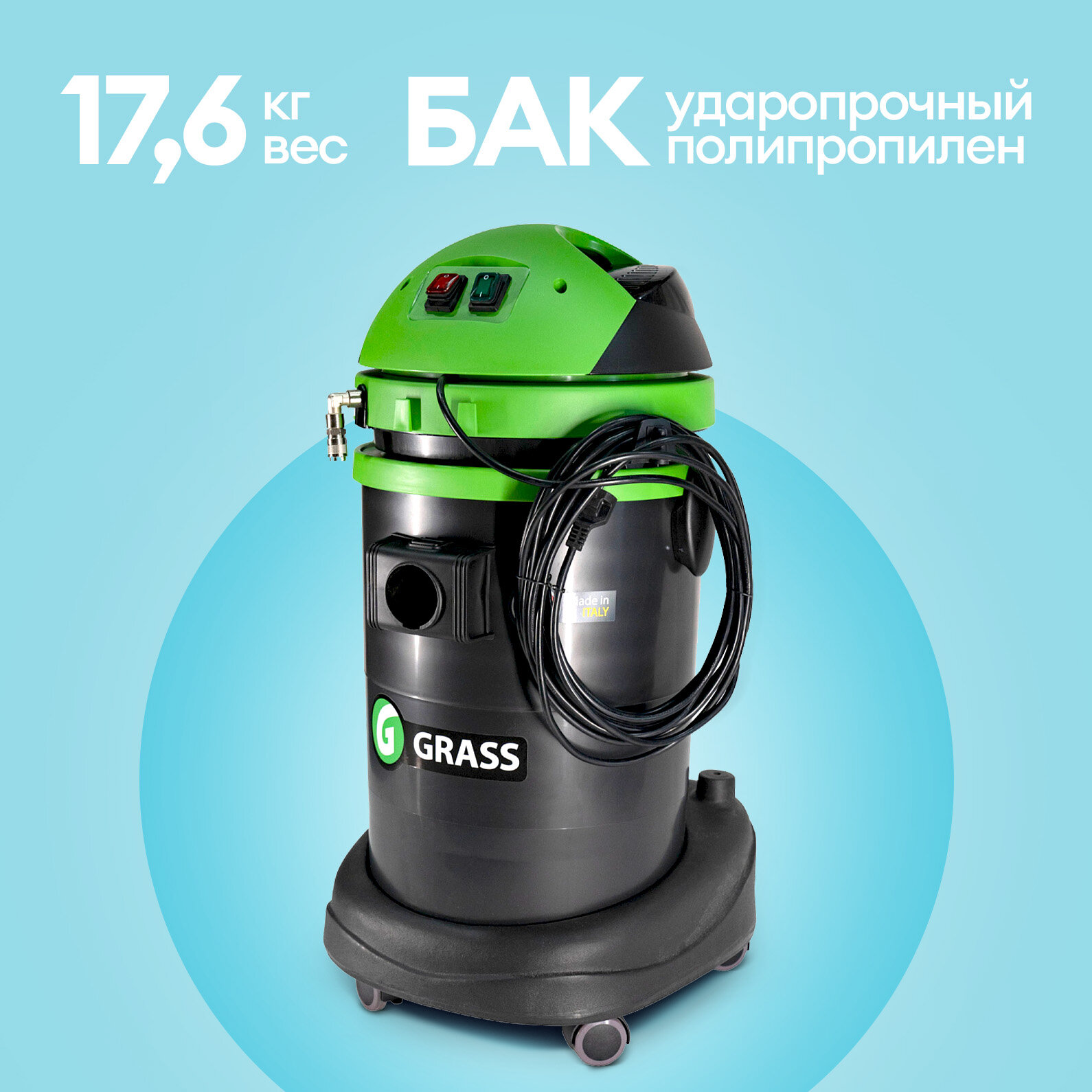 **Пылесос строительный Grass Estro WPV125** предназначен химчистки мебели и ковровых покрытий. Оснащен 36 литровым баком из ударопрочного полипропилена, использующимся для моющего раствора.