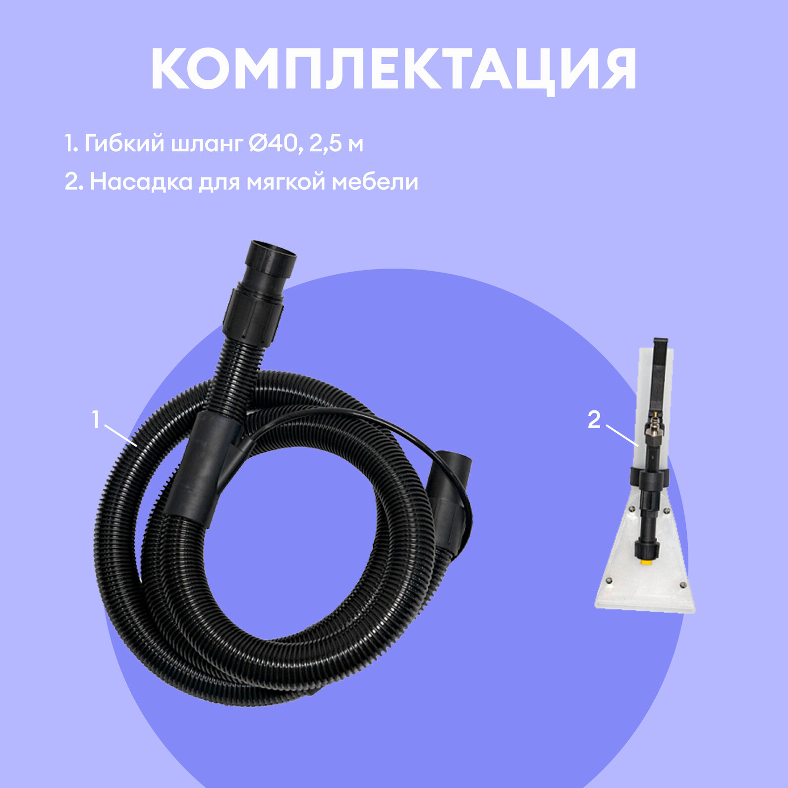 - комплектация: гибкий шланг, насадка для мебели, маленькая насадка, круглая щетка и узкая насадка.