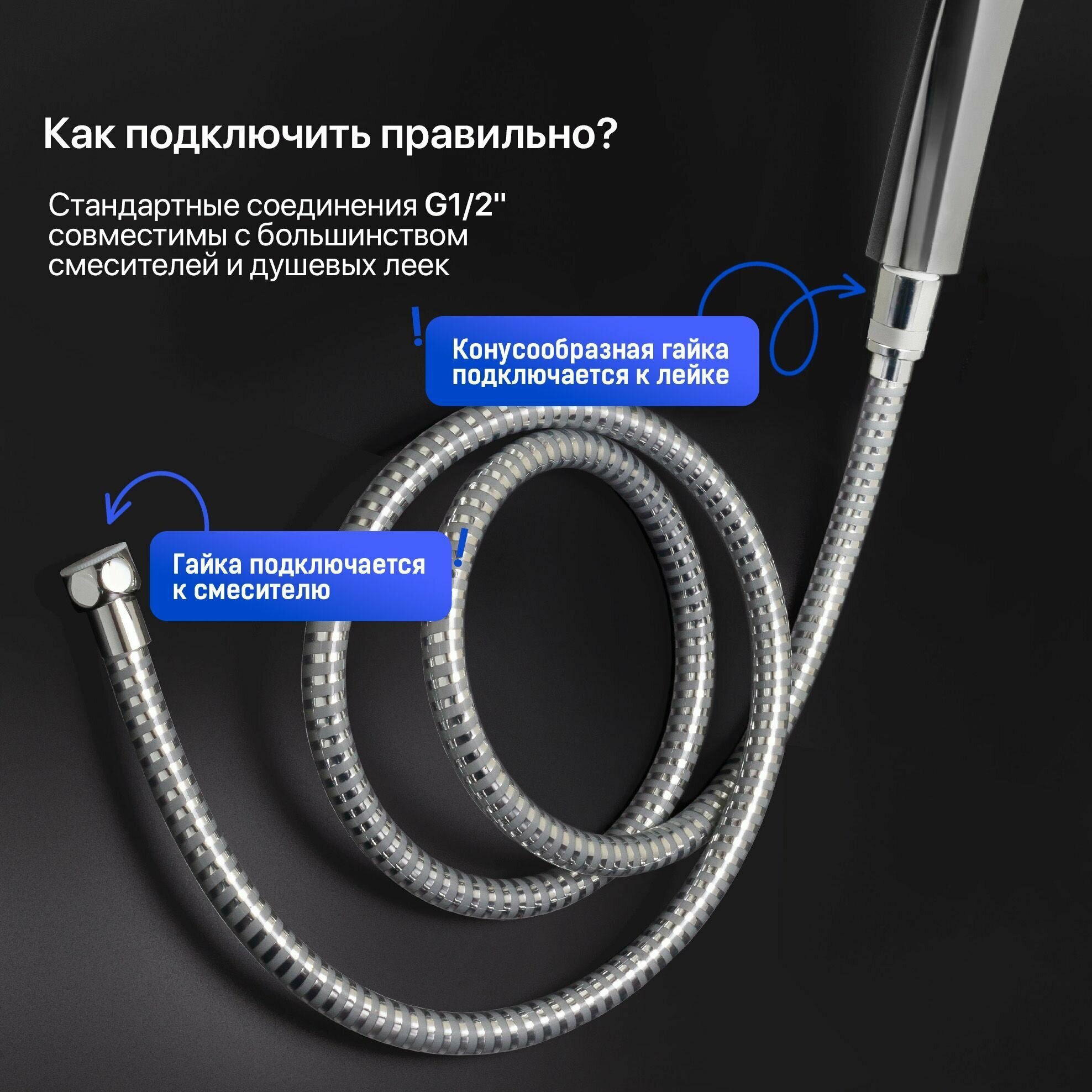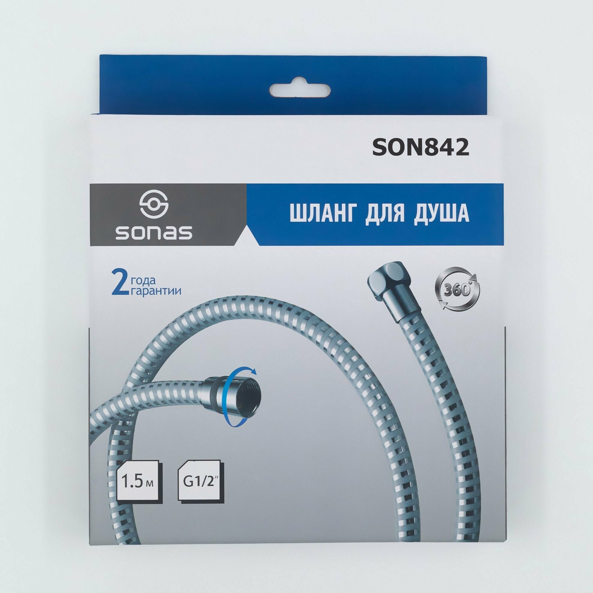 **Шланг Sonas SON842** предназначен для крепления к смесителю в душе. Шланг в металлической оплетке долгое время сохраняет функциональность и не теряет эстетических характеристик.