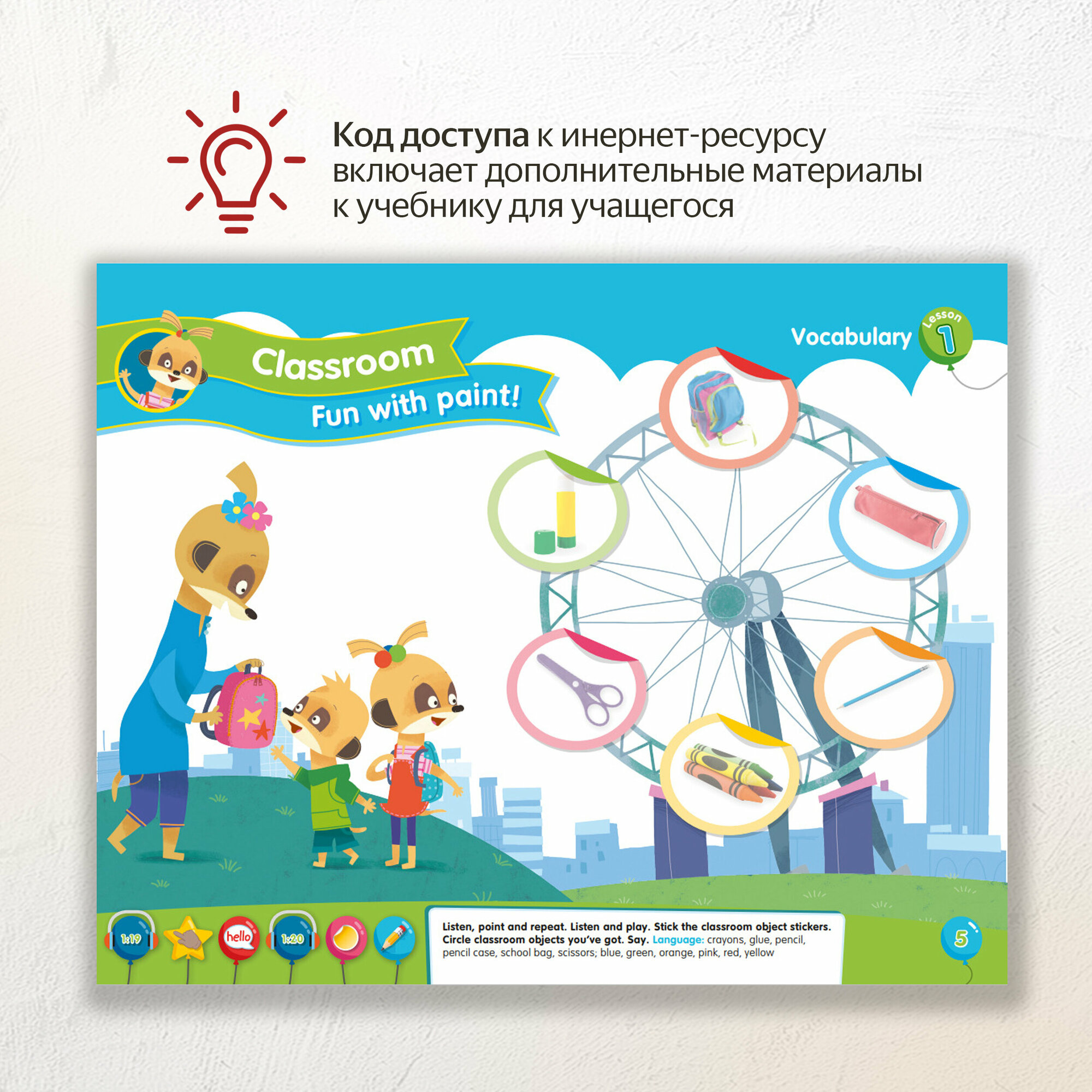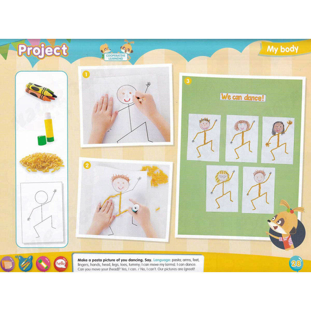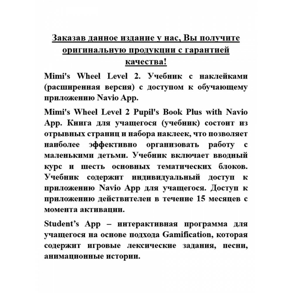 Книга для учащегося состоит из отрывных страниц и набора наклеек, что позволяет наиболее эффективно организовать работу с маленькими детьми. Учебник включает вводный курс и шесть основных тематических блоков. Учебник содержит код доступа к приложению Navio App для учащегося.