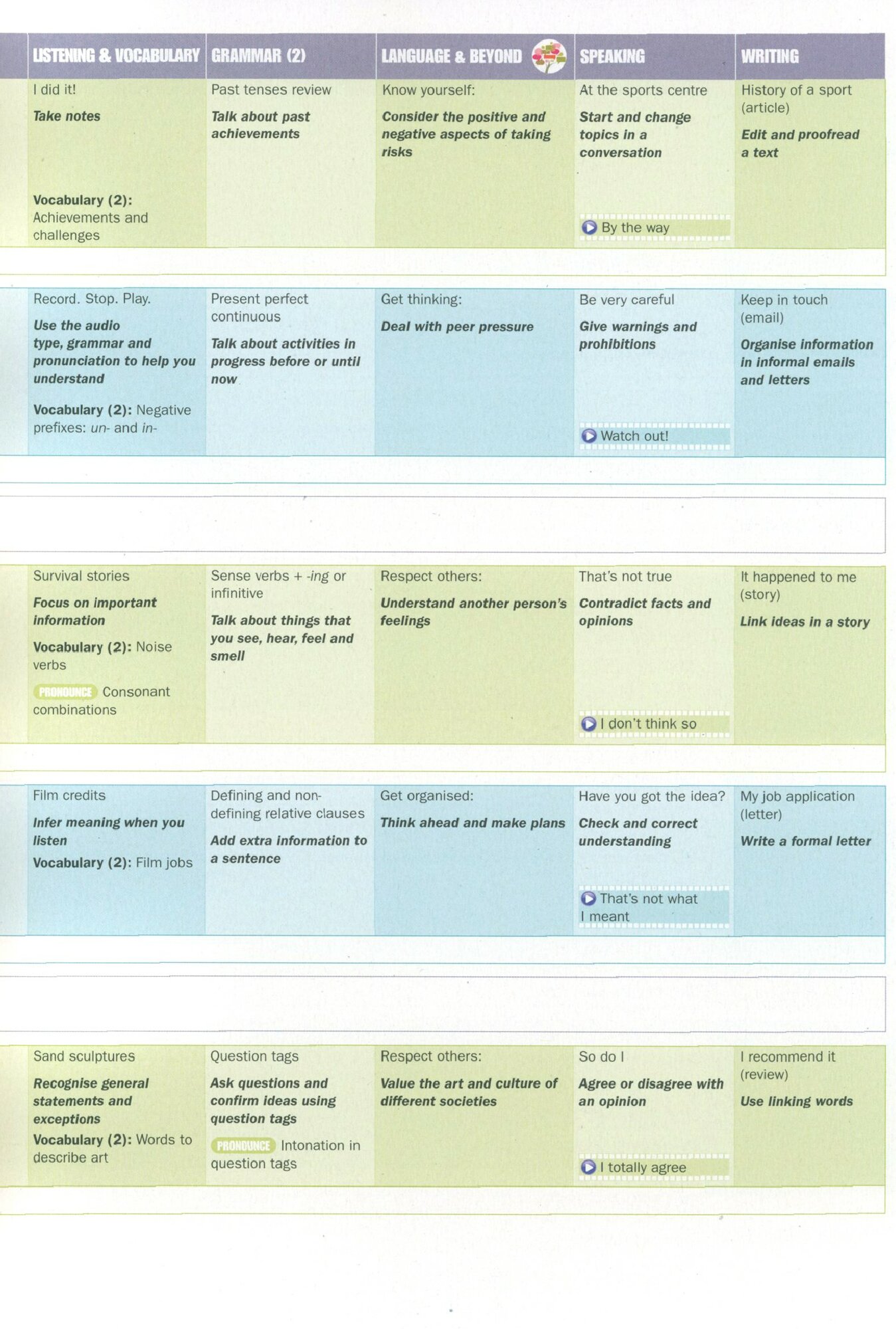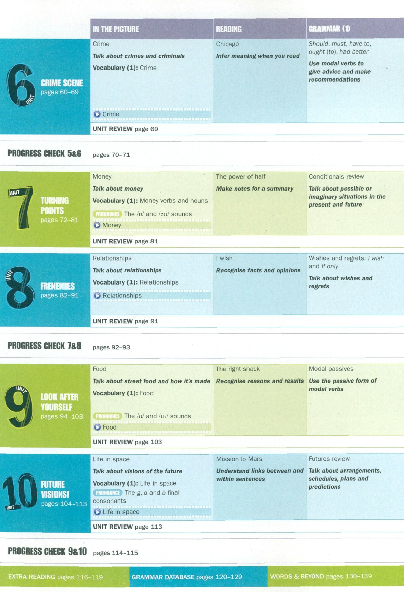 Учебник содержит 10 разделов и рассчитан на программу от двух и более часов в неделю. Обучение основывается на ситуациях из реальной жизни и поддерживается набором соответствующих стратегий для наиболее эффективного понимания материала и улучшения речевых навыков учащихся.