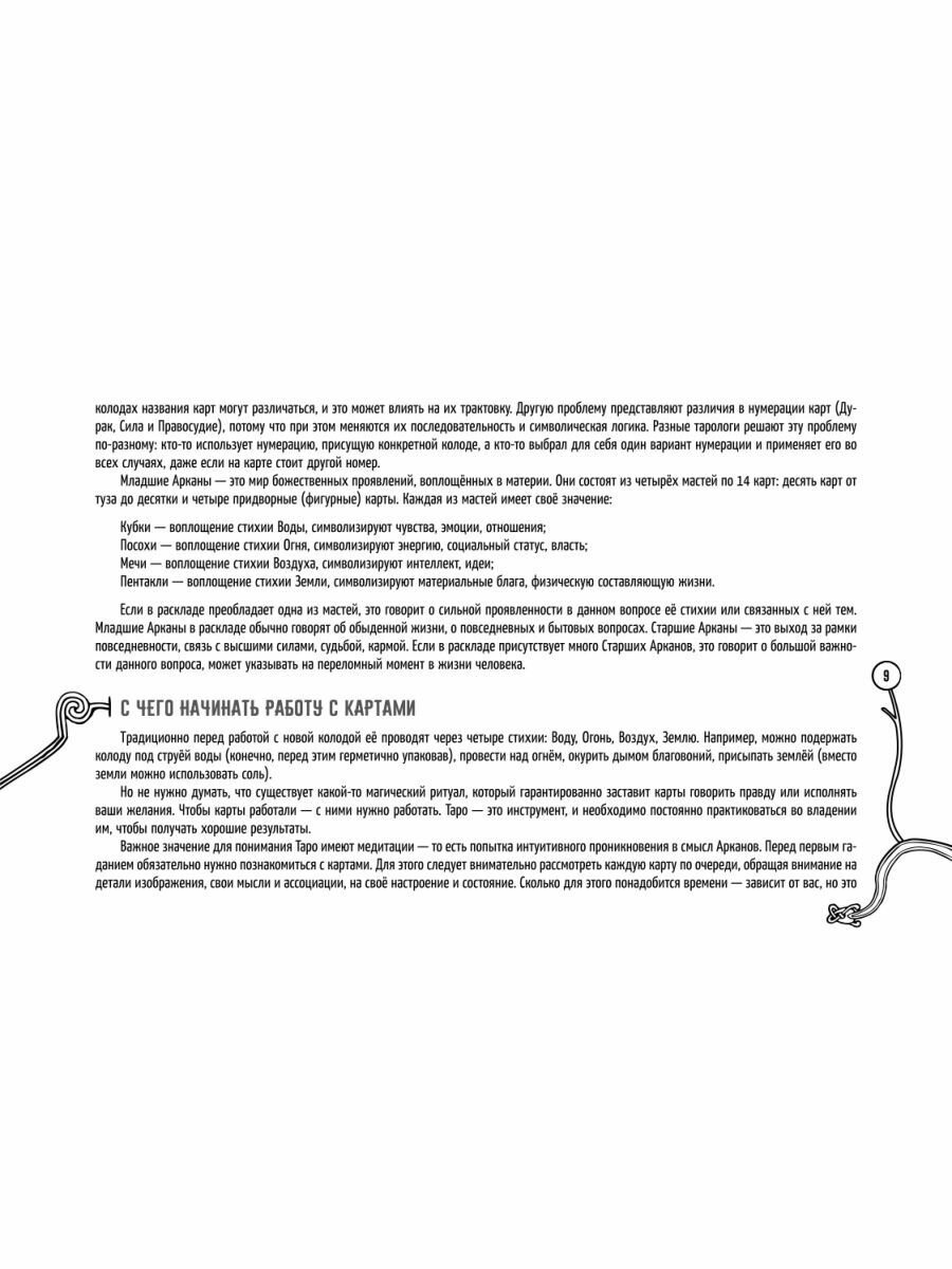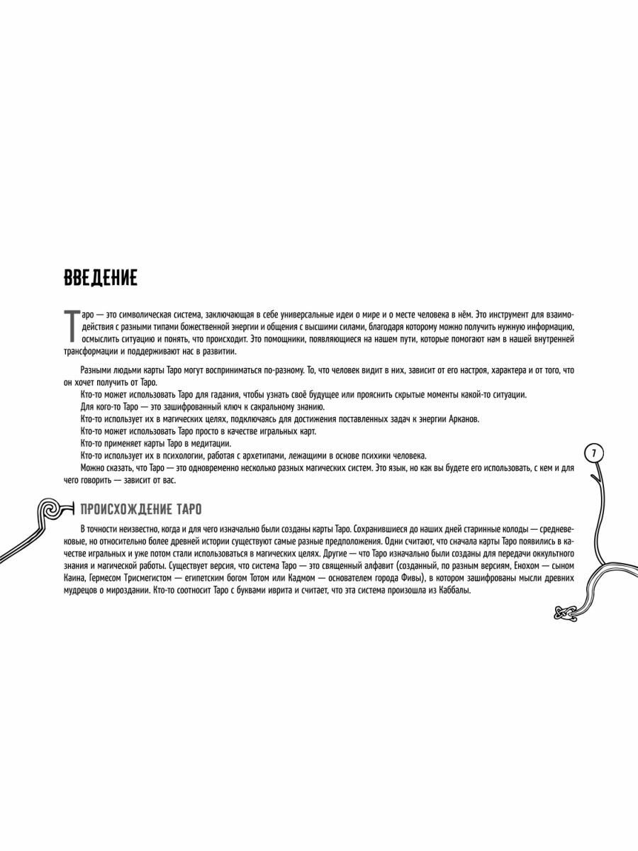 "Таро — это символическая система, заключающая в себе универсальные идеи о мире и о месте человека в нём. Это инструмент для взаимодействия с разными типами божественной энергии и общения с высшими силами, благодаря которому можно получить нужную информацию, осмыслить ситуацию и понять, что происходит. Это помощники, появляющиеся на нашем пути, которые поддерживают нас в нашей внутренней трансформации и развитии".