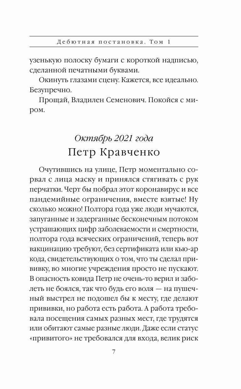 Читателю надо быть готовым к тому, что первый том \"Дебютной постановки\" представляет собой очень и очень затянувшийся пролог к грядущему расследованию. Хотя две сюжетные линии разделены временным промежутком в пятьдесят пять лет, основное внимание уделено событиям конца шестидесятых годов прошлого века и в большей степени различным реорганизациям милицейских министерств и ведомств. На этом фоне подробно описана жизнь семьи Губановых, которые видимо во второй книге сыграют решающую роль. Интригу автор заложила очень солидную, произведение читается легко и с удовольствием, заставляя ждать выхода второго тома.