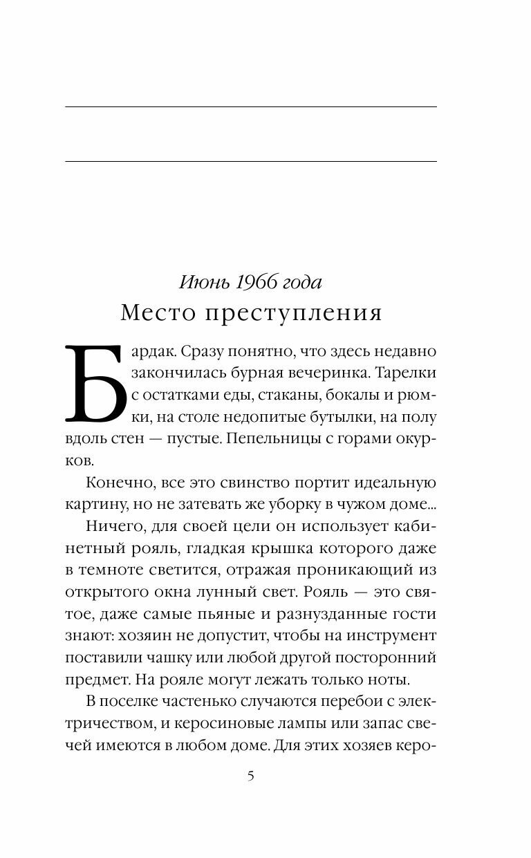 1966 год. В качестве подставки убийца выбрал черную, отливающую аспидным лаком крышку рояля. Расставил на ней тринадцать блюдец и на них уже - горящие свечи. Внимательно осмотрел кушетку, на которой лежал мертвец, убрал со столика опустошенные коробочки из-под снотворного. Остался последний штрих, вишенка на торте… Убийца аккуратно положил на грудь певца фотографию женщины и полоску бумаги с короткой фразой, написанной печатными буквами.