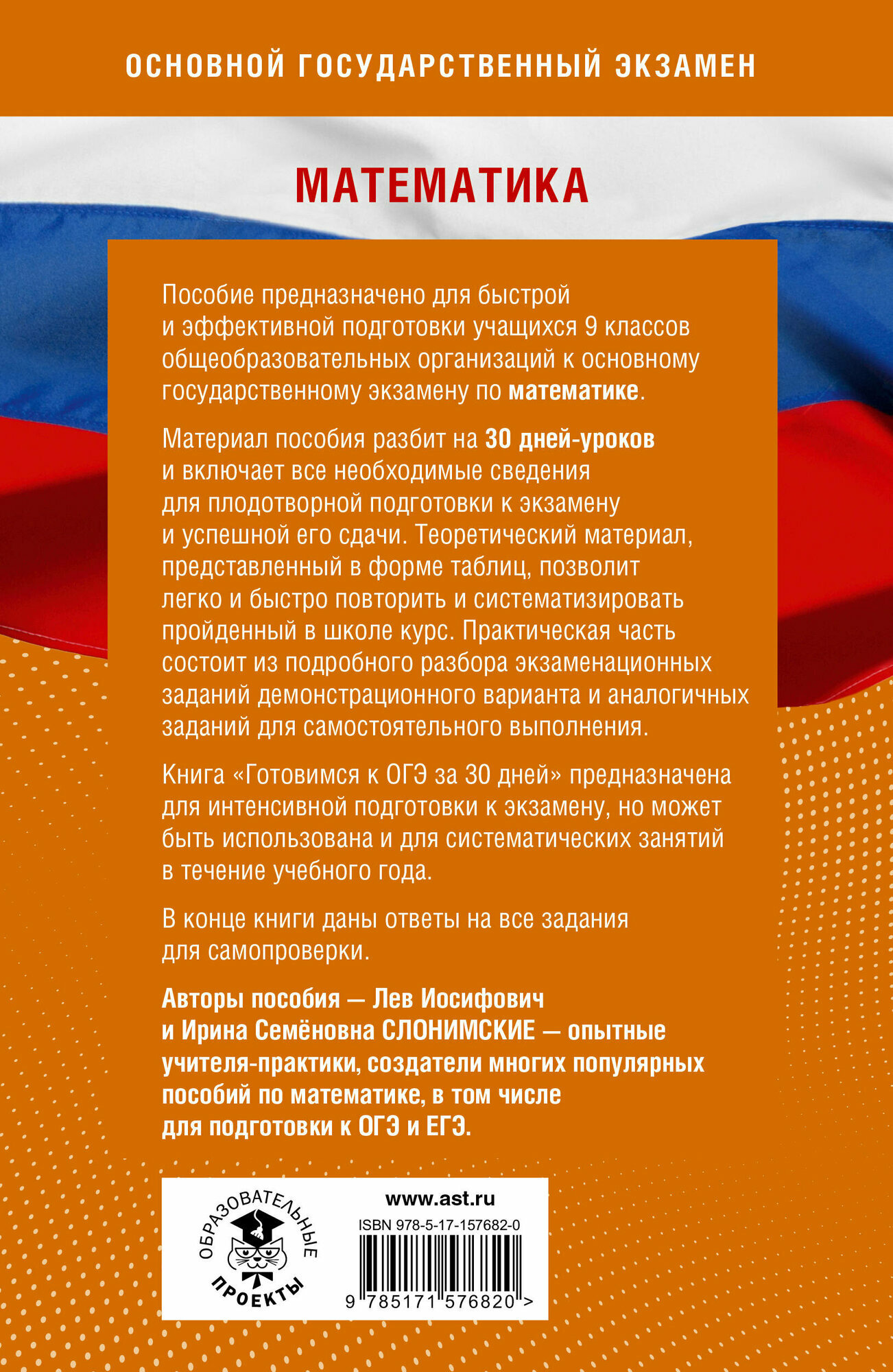 Авторы пособия — Лев Иосифович и Ирина Семёновна Слонимские — опытные учителя-практики, создатели многих популярных пособий по математике, в том числе для подготовки к ОГЭ и ЕГЭ.