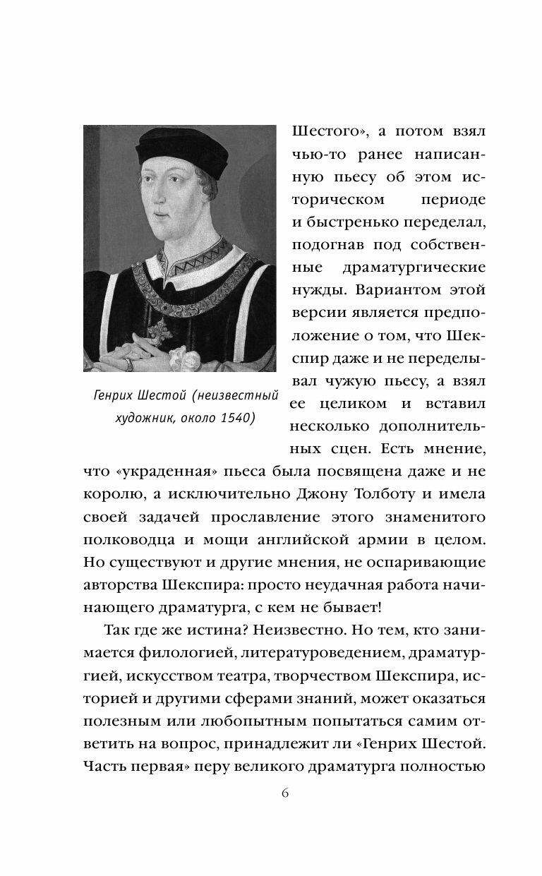 Восьми месяцев от роду занял отцовский трон. В девять лет был увенчан французской короной. Казалось, сбылась золотая мечта Вильгельма Завоевателя о «единой и неделимой» Англо-Французской монархии. Но не срослось… Потерял Генрих Шестой, все потерял! Столетнюю войну проиграл Жанне д’Арк с ее орлеанцами. Братоубийственную бойню Алой и Белой роз не предотвратил. Месяцами находился в шизофреническом ступоре. Злые языки шептались, что жена, прекрасная Маргарита Анжуйская, неверна. Власть уплывала из рук, а он грезил об идиллической жизни пастуха и поэта. В 49 лет последний из династии Ланкастеров оказался очевидцем убийства своего единственного сына Эдуарда и сам погиб в плену. Стоит ли удивляться, что творец принца Гамлета посвятил Генриху Шестому наиболее объемную свою пьесу!