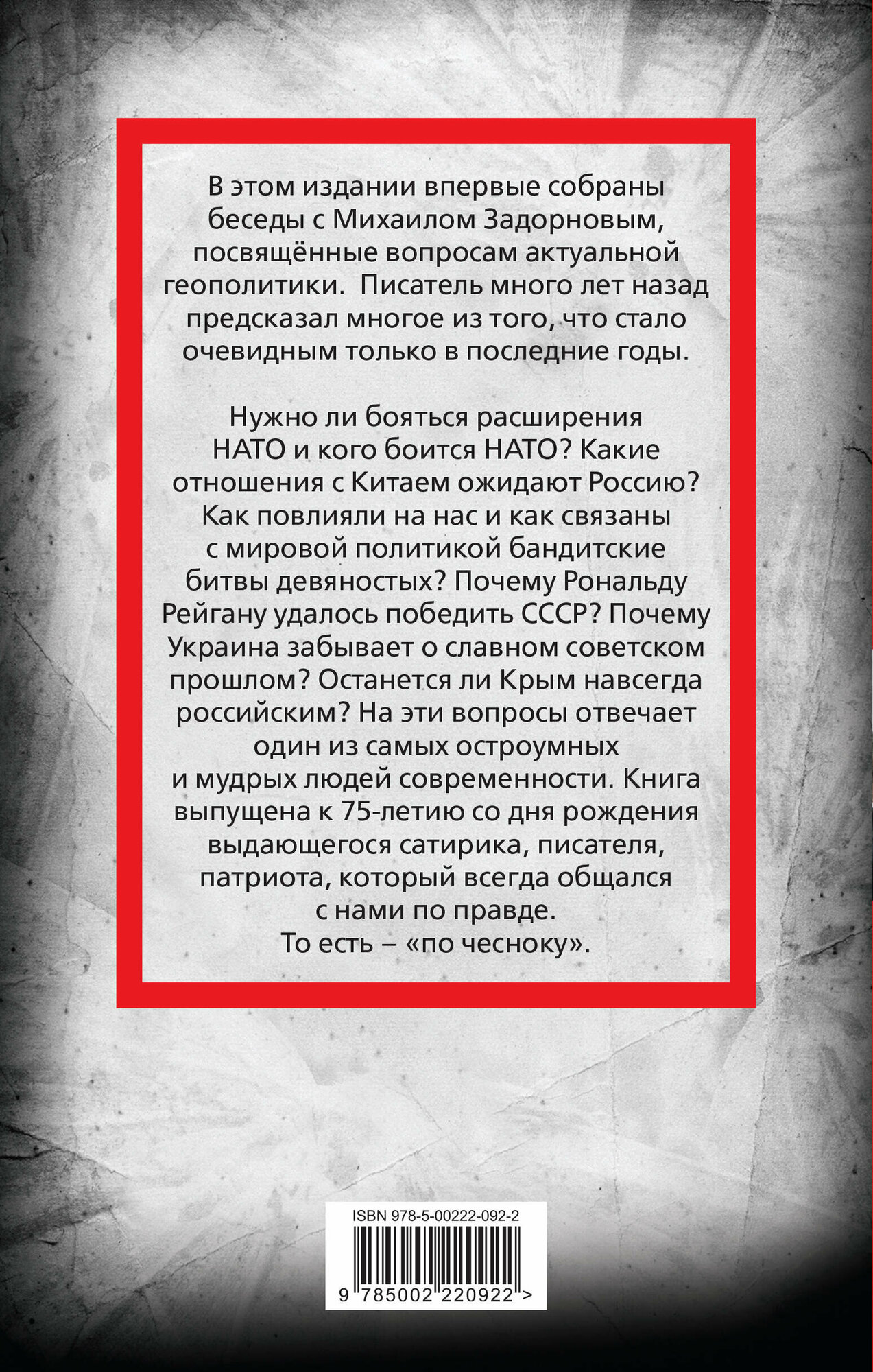 Нужно ли бояться расширения НАТО и кого боится НАТО? Какие отношения с Китаем ожидают Россию? Как повлияли на нас и как связаны с мировой политикой бандитские битвы девяностых? Как Рональду Рейгану удалось победить СССР? Почему Украина забывает о славном советском прошлом? Будет ли Крым навсегда российским? На эти вопросы отвечает один из самых остроумных и мудрых людей современности. Книга выпущена к 75-летию со дня рождения выдающегося сатирика, писателя, патриота, который всегда общался со зрителями и читателями по правде. То есть - "по чесноку".