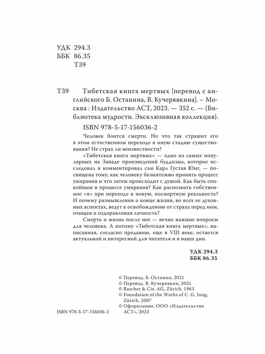 «Тибетская Книга мертвых» — одно из самых популярных на Западе произведений буддизма, которое исследовал и комментировал сам Карл Густав Юнг, — посвящена тому, как человеку безмятежно принять процесс умирания и что затем происходит с душой. Как быть спокойным в процессе умирания? Как распознать собственное «я» при переходе в новую, посмертную реальность? И почему размышления о конце жизни, во всех ее духовных аспектах, ведут к освобождению от страха перед ним, очищая и оздоравливая личность?
